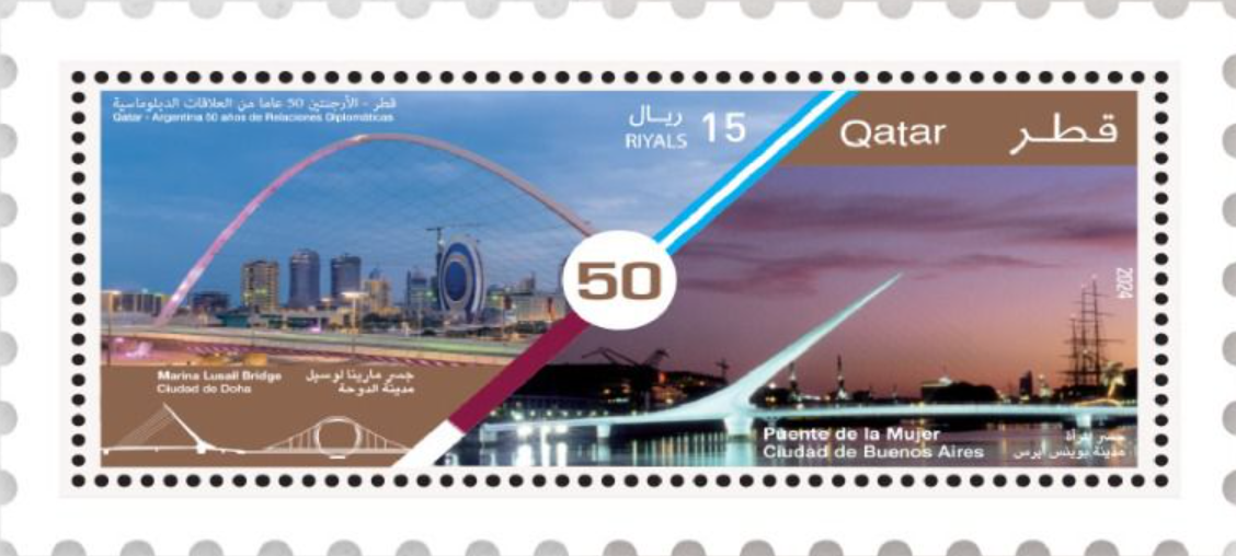 بمناسبة مرور 50 عاماً على العلاقات الدبلوماسية بين دولة قطر وجمهورية الأرجنتين، تصدر بريد قطر طابعاً تذكارياً خاصاً بعنوان Qatar – Argentina: 50 Años de Relaciones Diplomáticas، يجسد عمق العلاقة والتعاون المستمر بين البلدين. تم طباعة الطابع بجودة عالية بتقنية الأوفست عبر شركة Joh. Enschede الهولندية، ويتميز بتصميم أنيق بأبعاد 70 × 30 مم. تم إصدار 4,000 طابع فقط، بالإضافة إلى 700 مغلف لليوم الأول، مما يجعله من الإصدارات النادرة والمميزة لهواة جمع الطوابع.