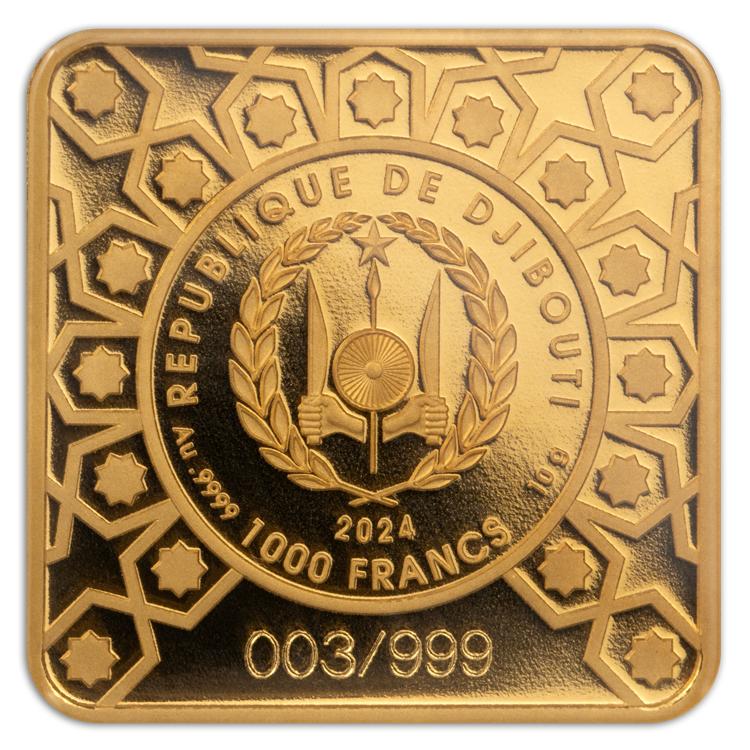 تتميز العملة بتصميم رائع وشكل مربع، يكشف عم جمال الخط العربي ورموزه، مع شهادة أصالتها.