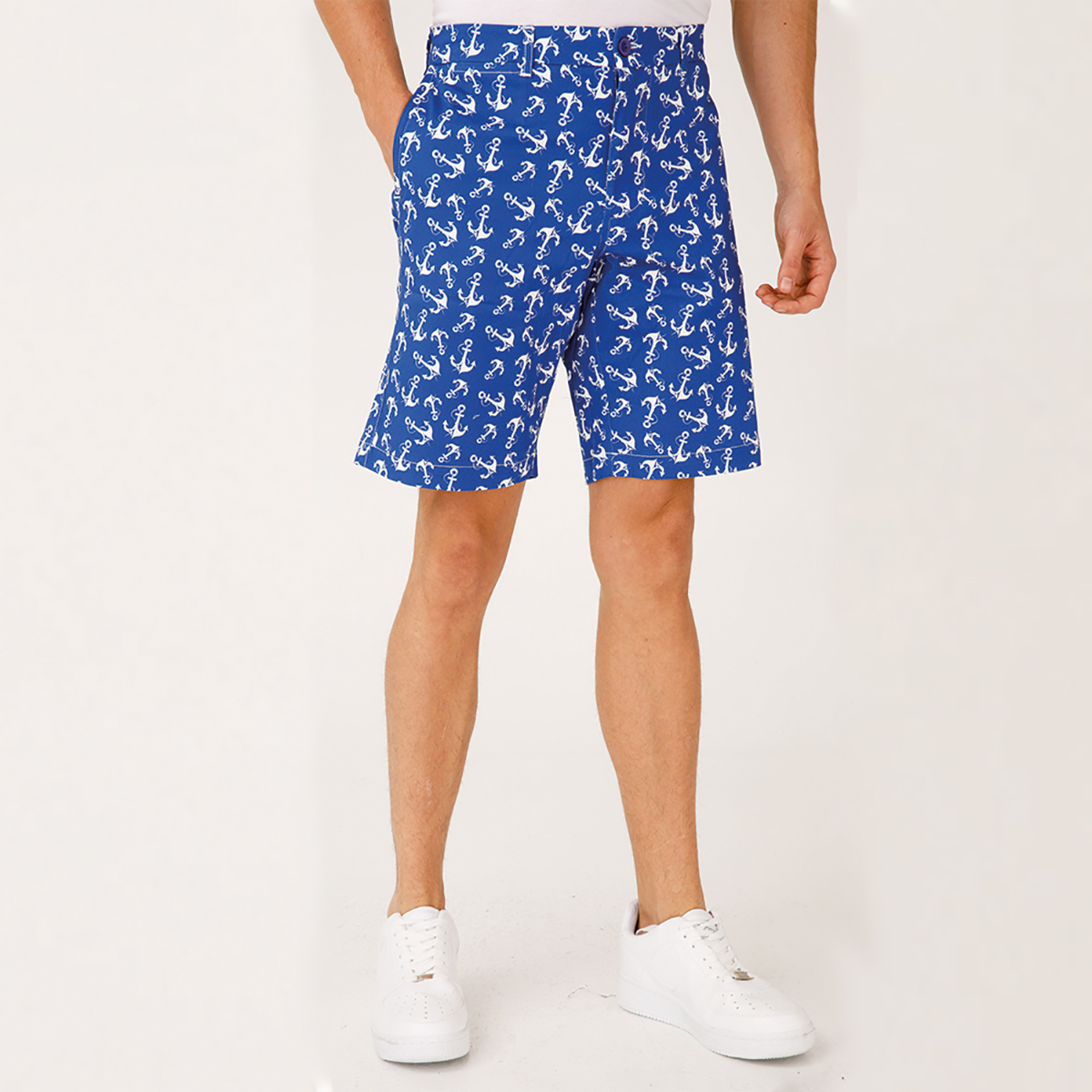 Shorts where Gamze Yalçın's Anchor pattern is applied. Shorts are the most beloved savior of summer for men. Shorts that keep you comfortable all day long and add air to your body; It is one of the alternatives that can be preferred for wearing on weekends, travel, holiday places, sports, beach or at home. Men's shorts made of cotton fabric with zipper and button closure, two side pockets, one back pocket and seamed hem at the bottom. Its main color is dark blue and it has white anchor digital printed patterns. 98% Cotton, 2% Elastane. It can get a classic look with other t-shirts, shorts and shoes.