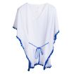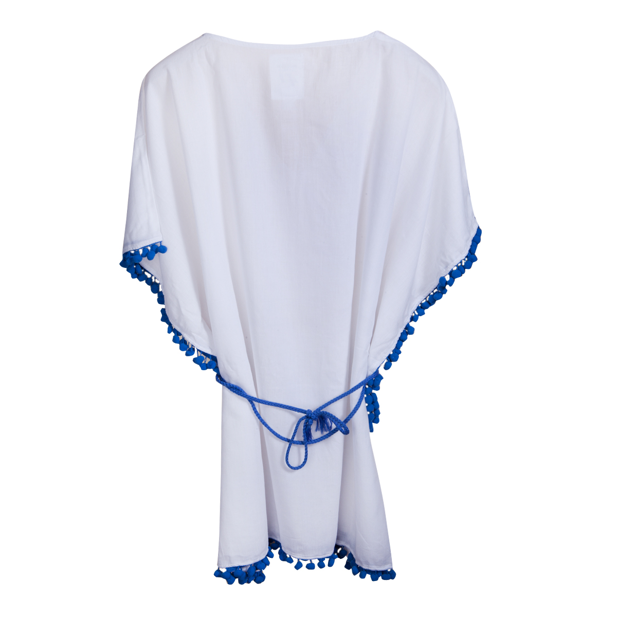 ANEMOSS BEACH DRESS: Anemoss Pom Pom Beach Dress is made from 100% Buldan fabric. It features a white color with blue pom pom details, making it a perfect match for any outfit. It comes in a tie-waist model and is available in S/M sizes.