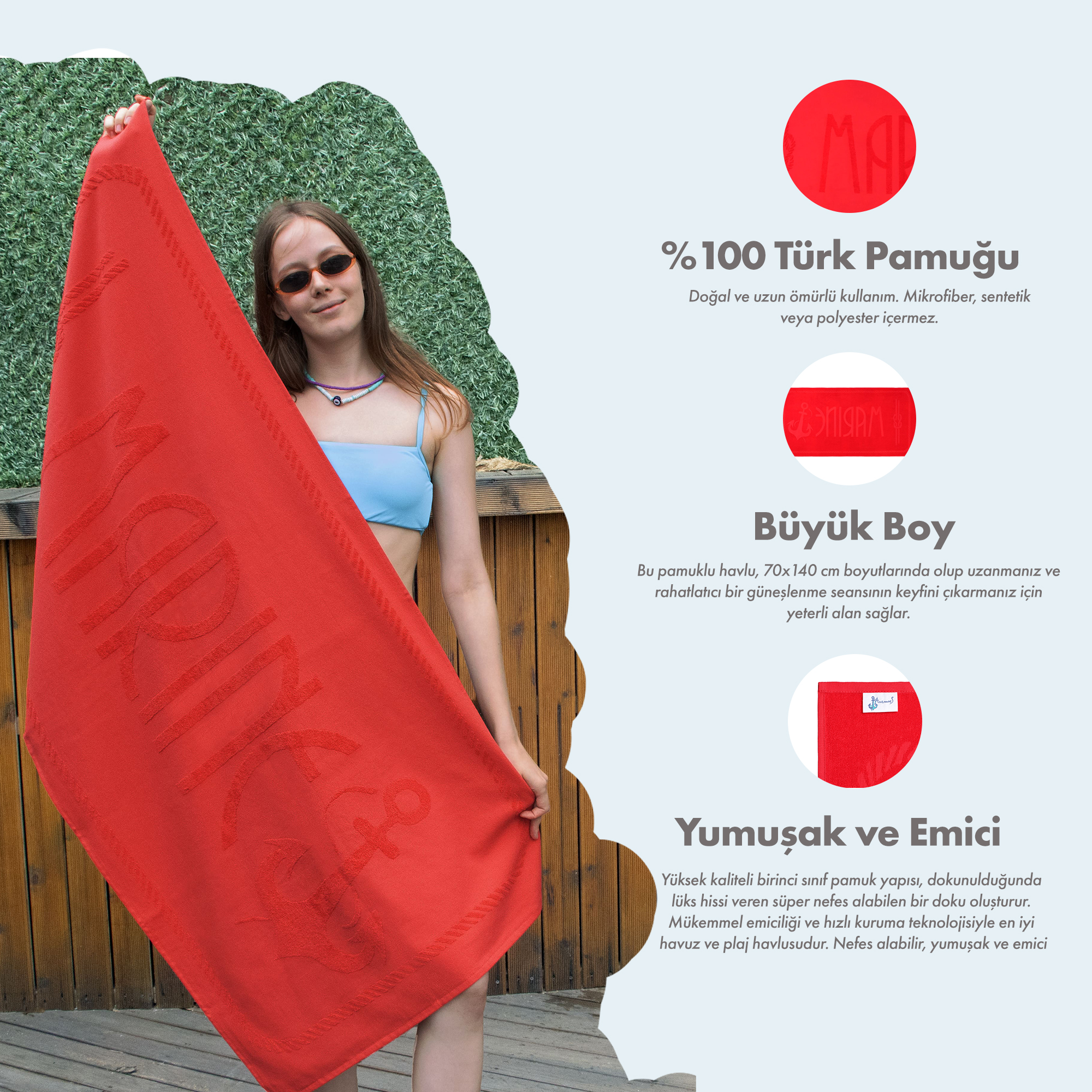 ANEMOSS BEACH TOWEL: Anemoss beach towel is made from %100 Turkish cotton to ensure safe, natural and long lasting use. Free of microfibre, synthetic, or polyester. Beautiful to skin.