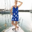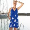 CUT&DESIGN: This dress slips on easily and looks glamorous. It has a lovely natural shape. The cotton fabric feels really light and the shape is fitted without clinging to the body. It has an open back. The light colour looks best with a bit of a tan and how cute are the crab details?
