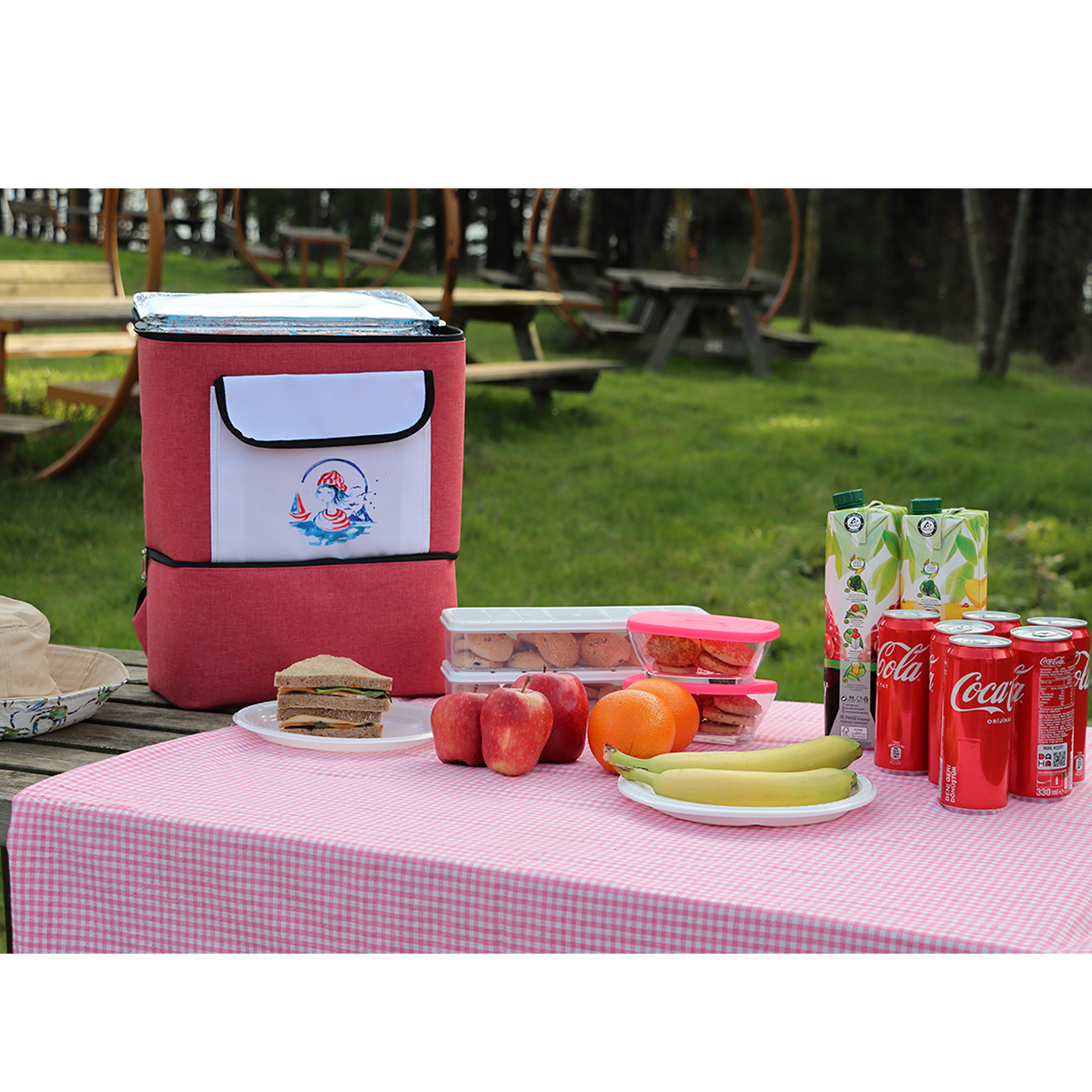 DIMENSIONS&VOLUME: To enhance the user’s experience, this double deck insulated lunch bag designed with 2 compartments which you can store hot and cold food&drinks at the same. Bottom compartment is 6x12x6 in - 7 quart, top compartment is, 8x12x6 in - 11 quart. It has a total height of 15 in , a depth of 12 in, a width of 6 in with 18 quart insulated storage