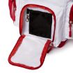 DIMENSIONS: This small picnic backpack has a height of 8 in, a depth of 11 in, a width of 6 in. It has a wide zipper open design to put your lunch containers into the bag or taken out of the bag vertically to prevent any possible leaking out