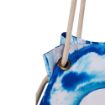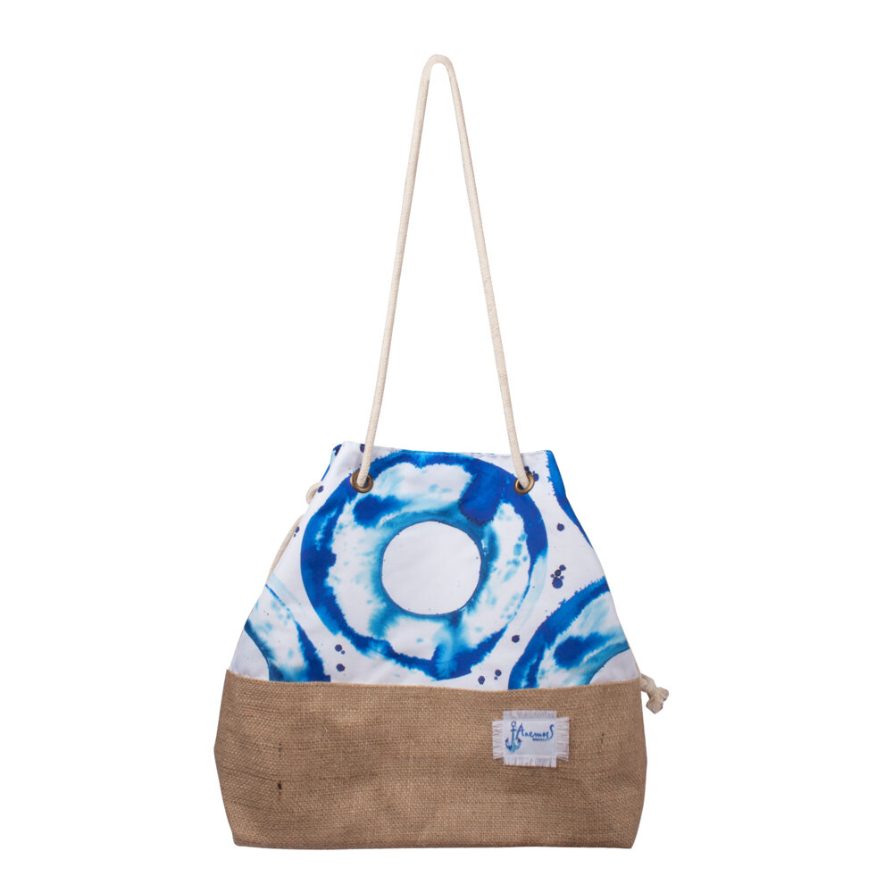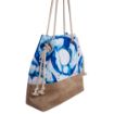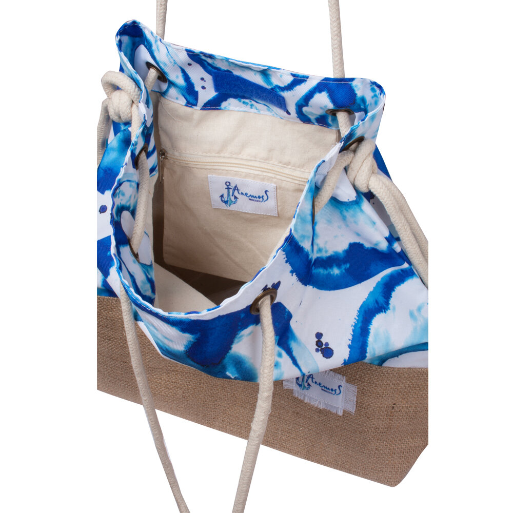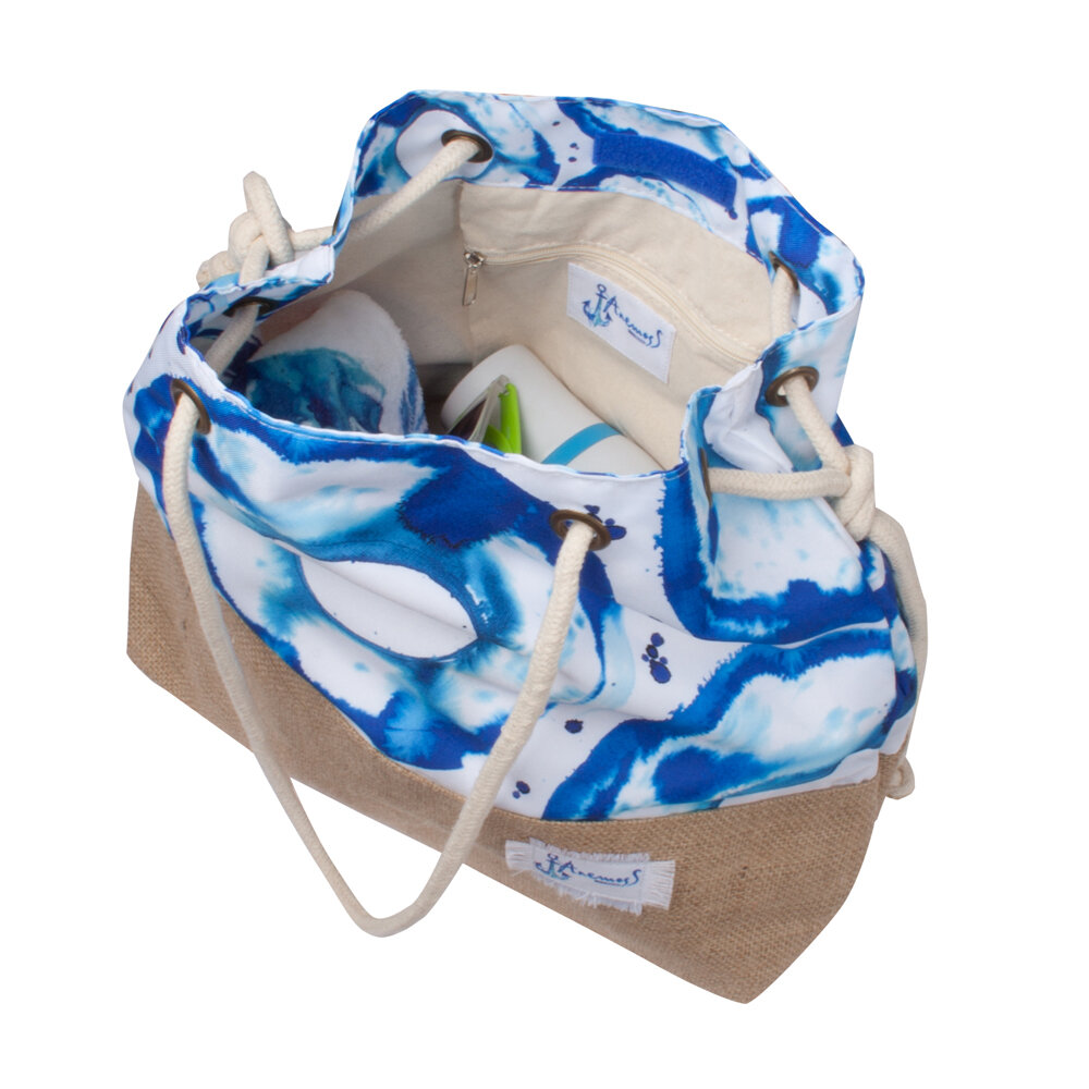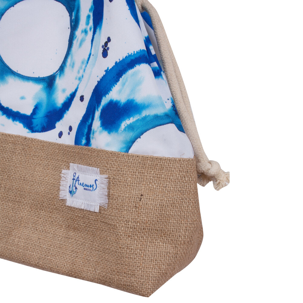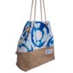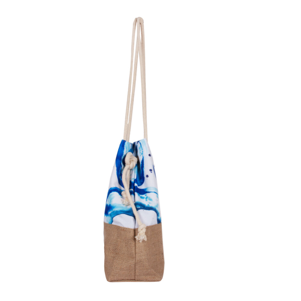 The bottom half of the bag is jute fabric and the top half is polyester fabric.The main color of the polyester part is white and there are blue patterns on it.Length: 37 cm, Width: 40cm.