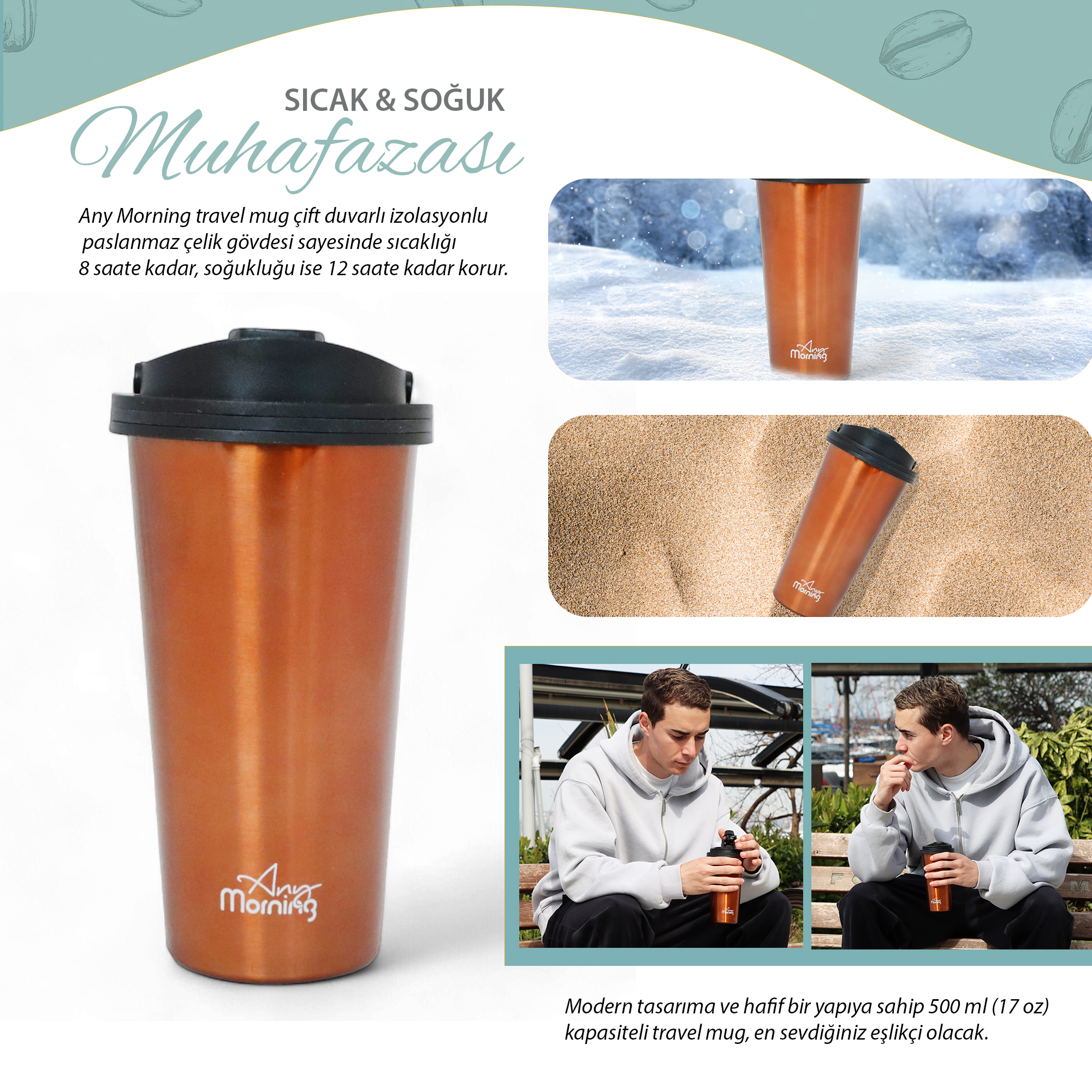 HOT & COLD RETENTION: Any Morning travel mug maintains heat for up to 8 hours and cold for up to 12 hours via its double wall insulated stainless steel body. The 500 ml (17 oz) capacity coffee mug with modern design and light body will be your favorite accompaniment.