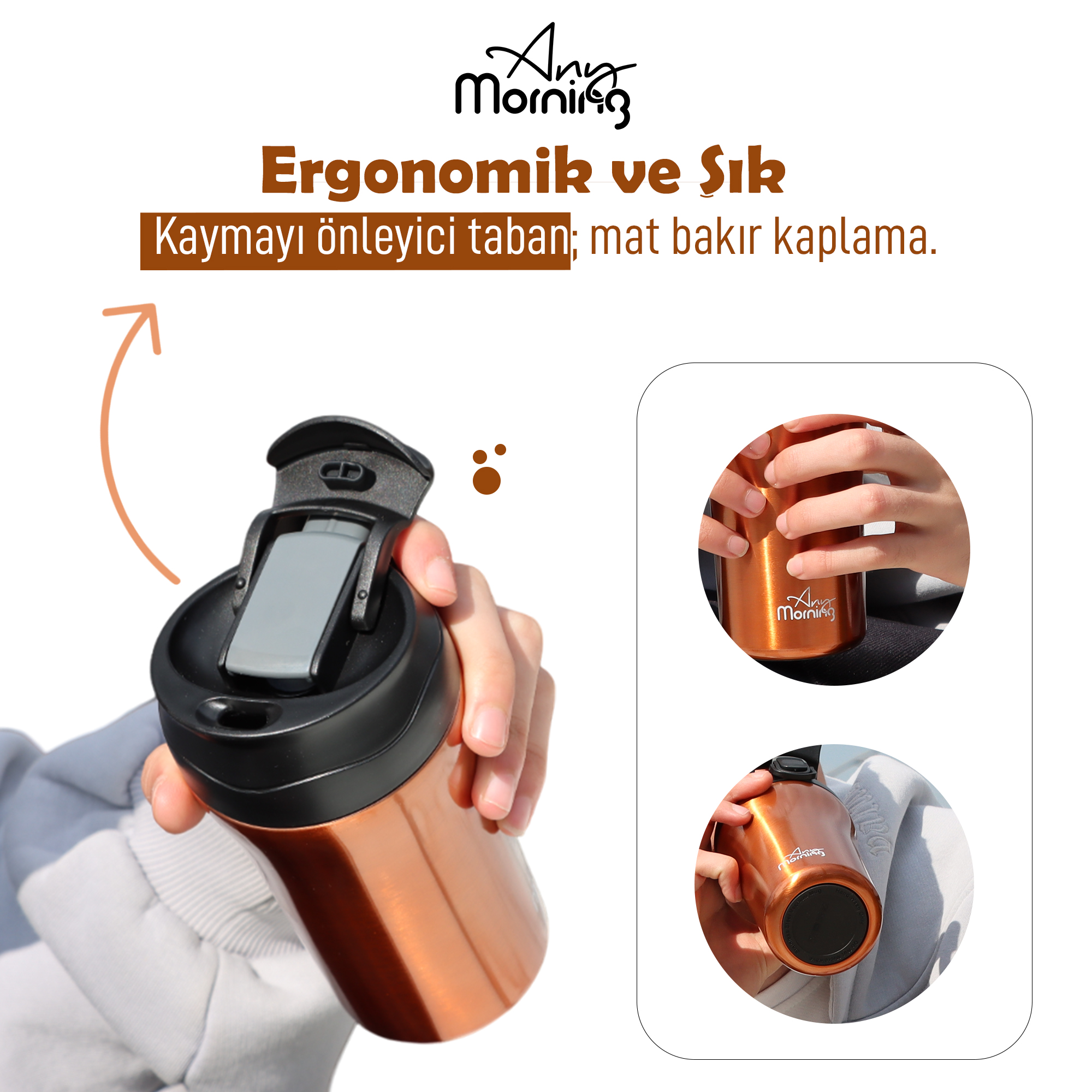 Long-Lasting Temperature Retention: The Any Morning leak-proof thermos mug, with its double-layer insulated stainless steel body (18/8), effectively retains heat for up to 8 hours and keeps cold beverages fresh for up to 12 hours. With a sleek design and a lightweight body, this 400 ml coffee mug is perfect for maintaining your beverage at the right temperature throughout the day.