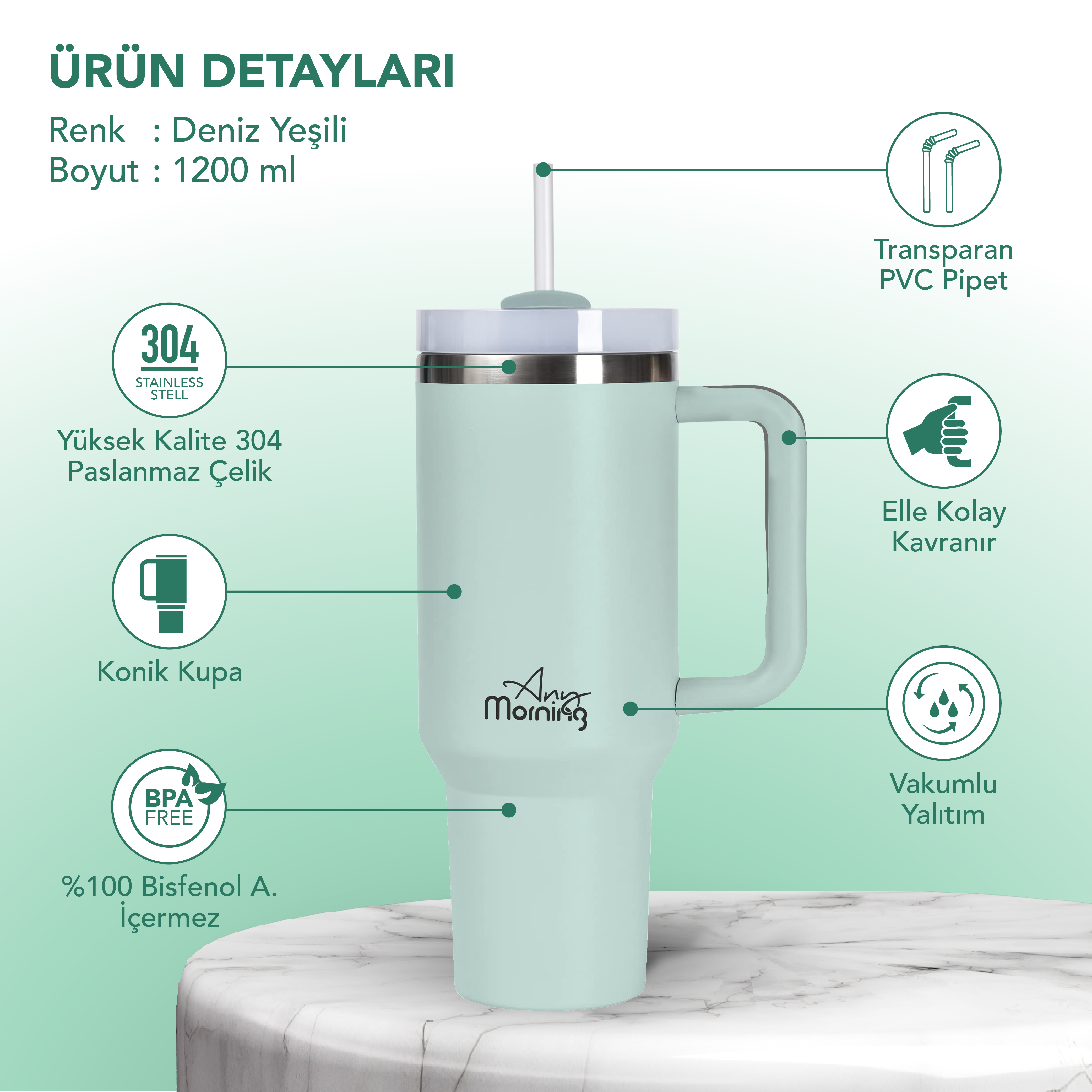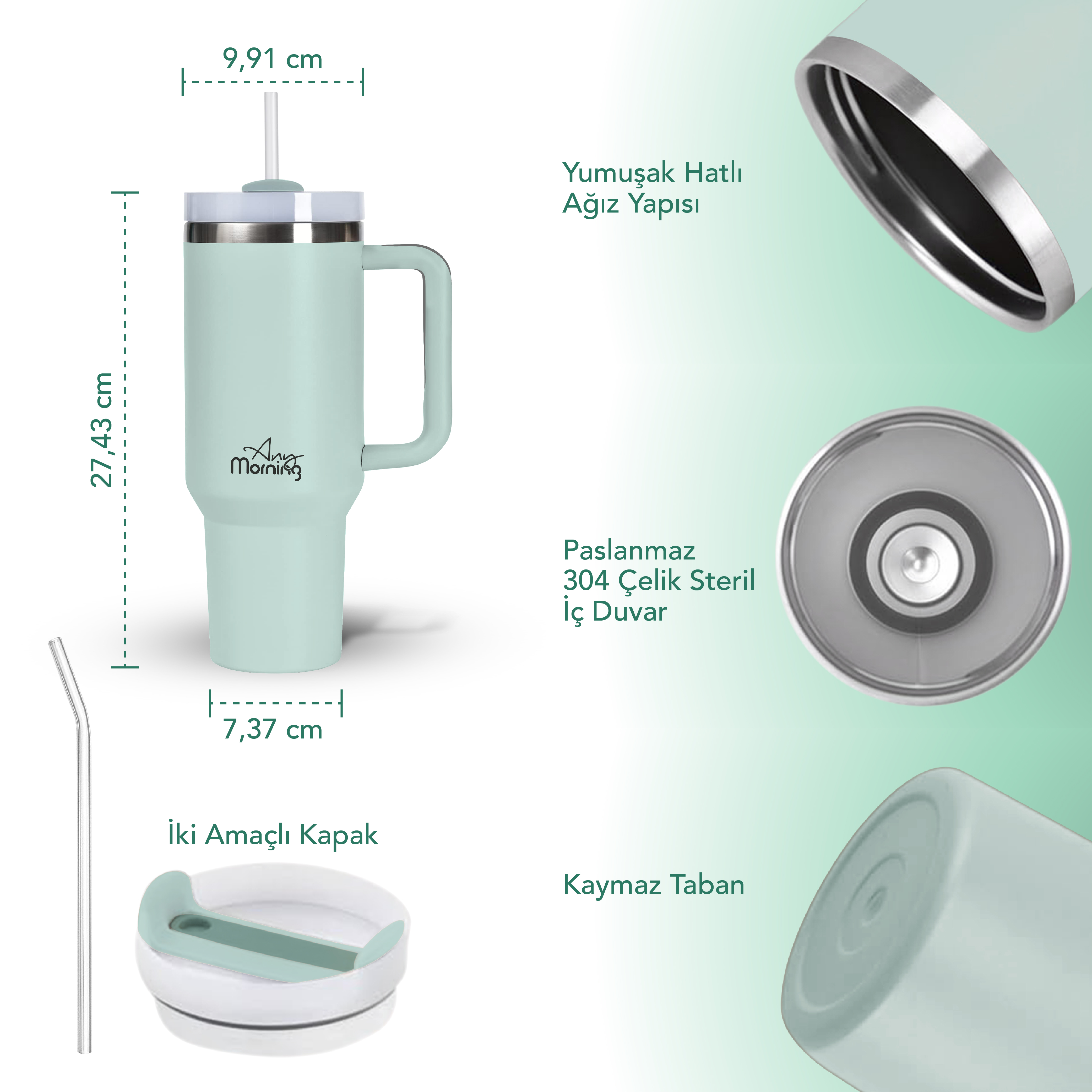 The Any Morning Thermos Mug is the perfect companion for keeping your beverages at the ideal temperature, no matter where you are. Its large 1200 ml (40.58 oz) capacity makes it highly suitable for long journeys, office work, camping activities, or daily use. The double-layer stainless steel body retains heat for up to 9 hours and keeps beverages cold for up to 12 hours, ensuring your drink stays at your preferred temperature in every season.