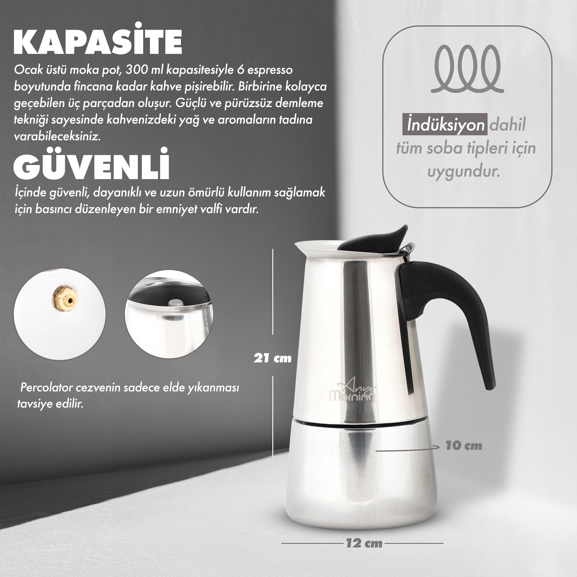 With a 300 ml capacity, this moka pot can brew up to 6 espresso-sized cups of coffee. It consists of three parts: the bottom water chamber, the coffee filter, and the top brewing chamber, ensuring easy and convenient use. The safety valve regulates excess pressure, ensuring a secure brewing process.