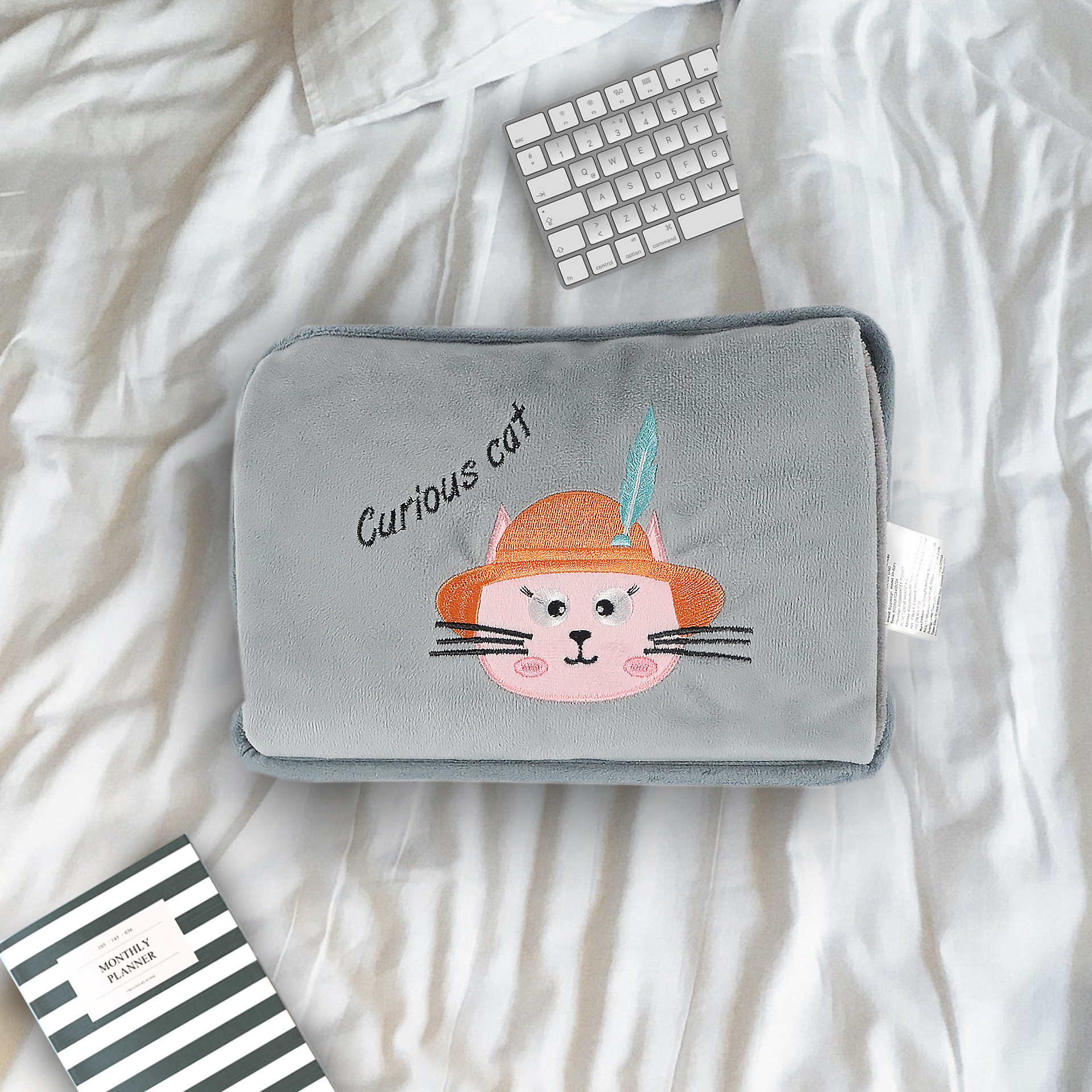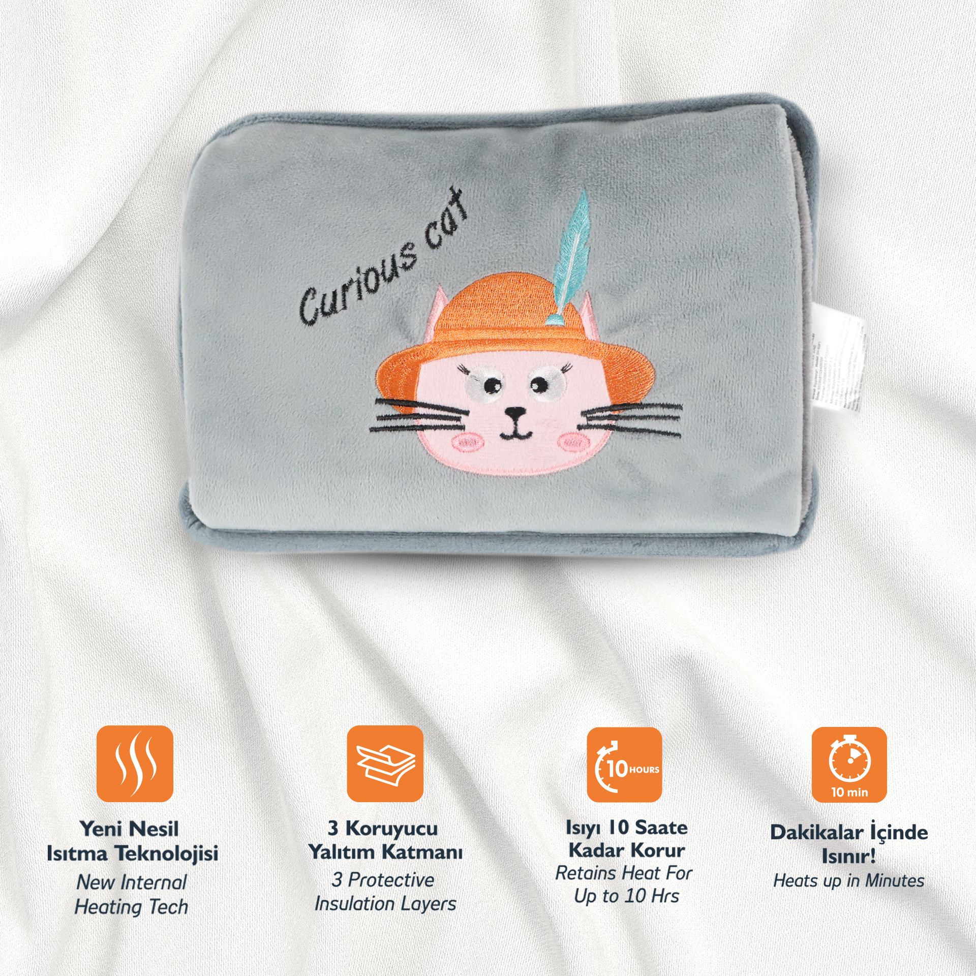 ELECTRIC HOT WATER BOTTLE: Biggdesign plush hot water bottle with a kind cat design has a soft texture, it keeps you comfortable and warm on cold winter days. It has 27x20x4.5 cm dimensions and 1 LT capacity. Consumes 400W of electricity and has hydroelectricity separation.