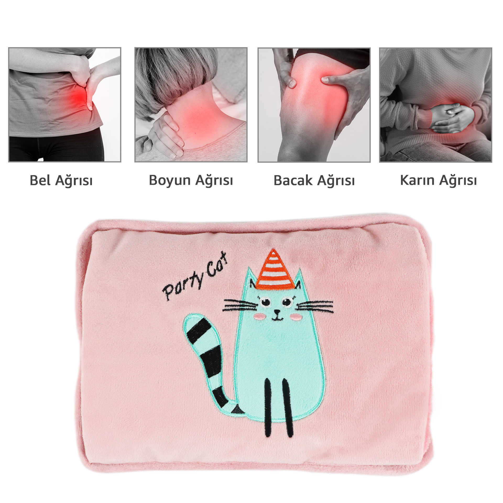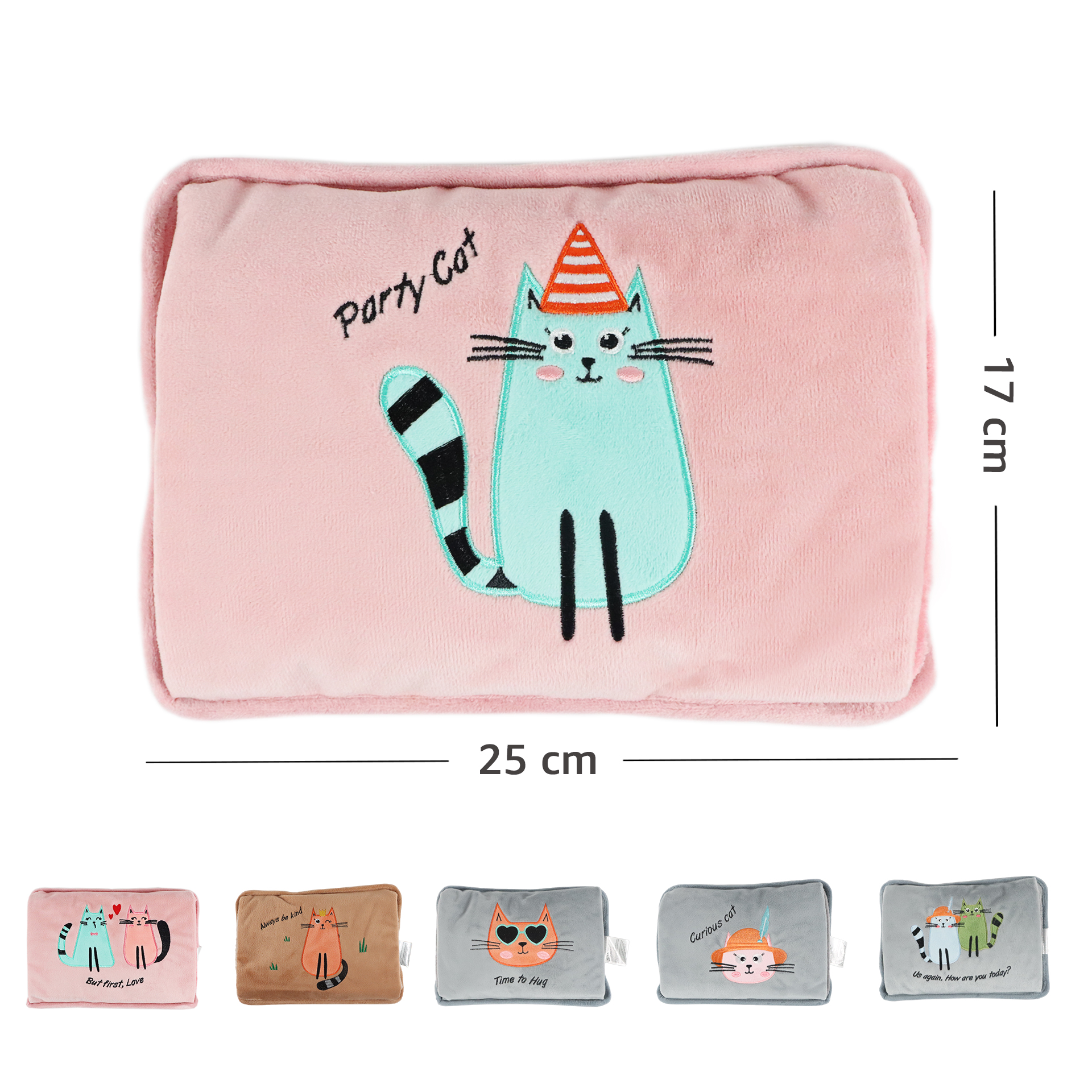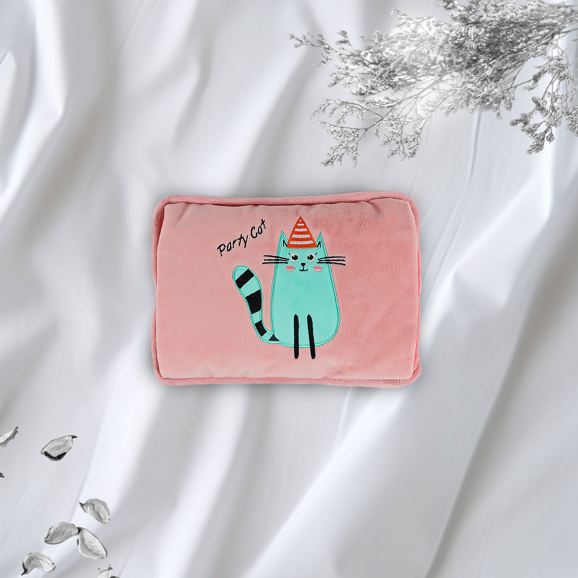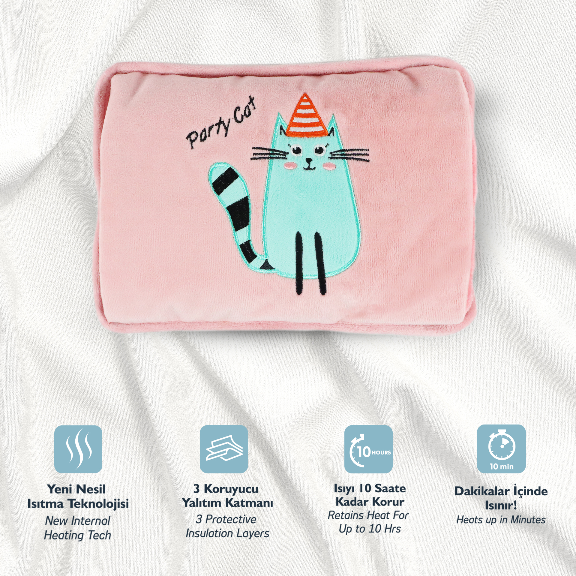 ELECTRIC HOT WATER BOTTLE: The plush hot water bottle with a party cat design has a soft texture, it keeps you comfortable and warm on cold winter days. It has 27x20x4.5 cm dimensions and 1 LT capacity. Consumes 400W of electricity and has hydroelectricity separation.