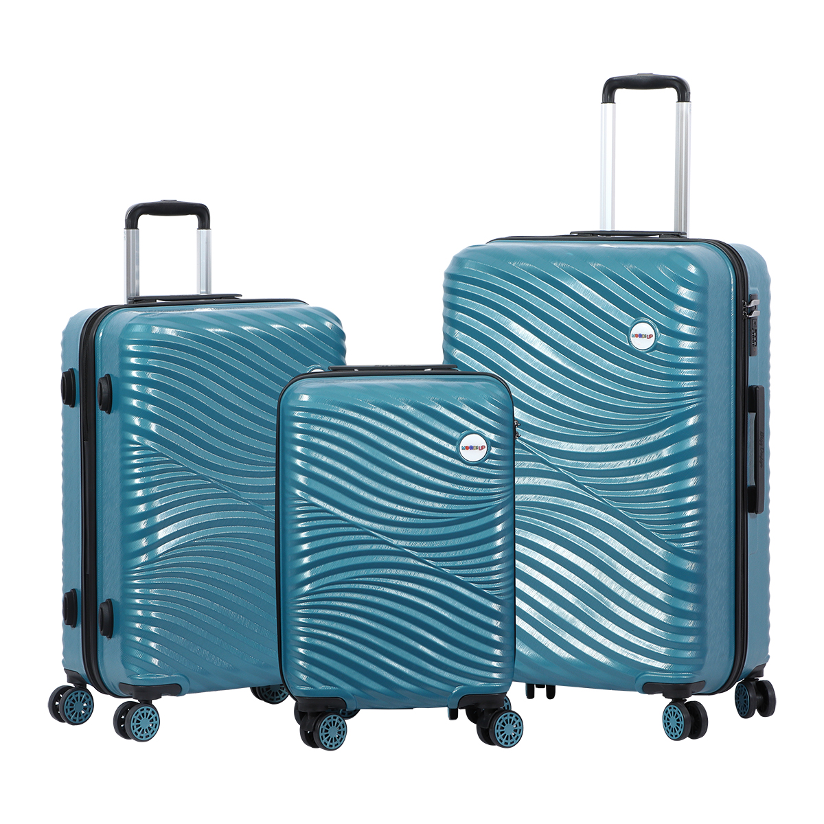 The Biggdesign Moods Up Blue 3-Piece Luggage Set is crafted from 100% pure ABS material, providing superior impact resistance while maintaining a lightweight design. This set includes three sizes: cabin (20"), medium (24"), and large (28"), making it suitable for all types of travel. The 360° rotating, silent, silicone-coated double wheels ensure smooth and effortless mobility.