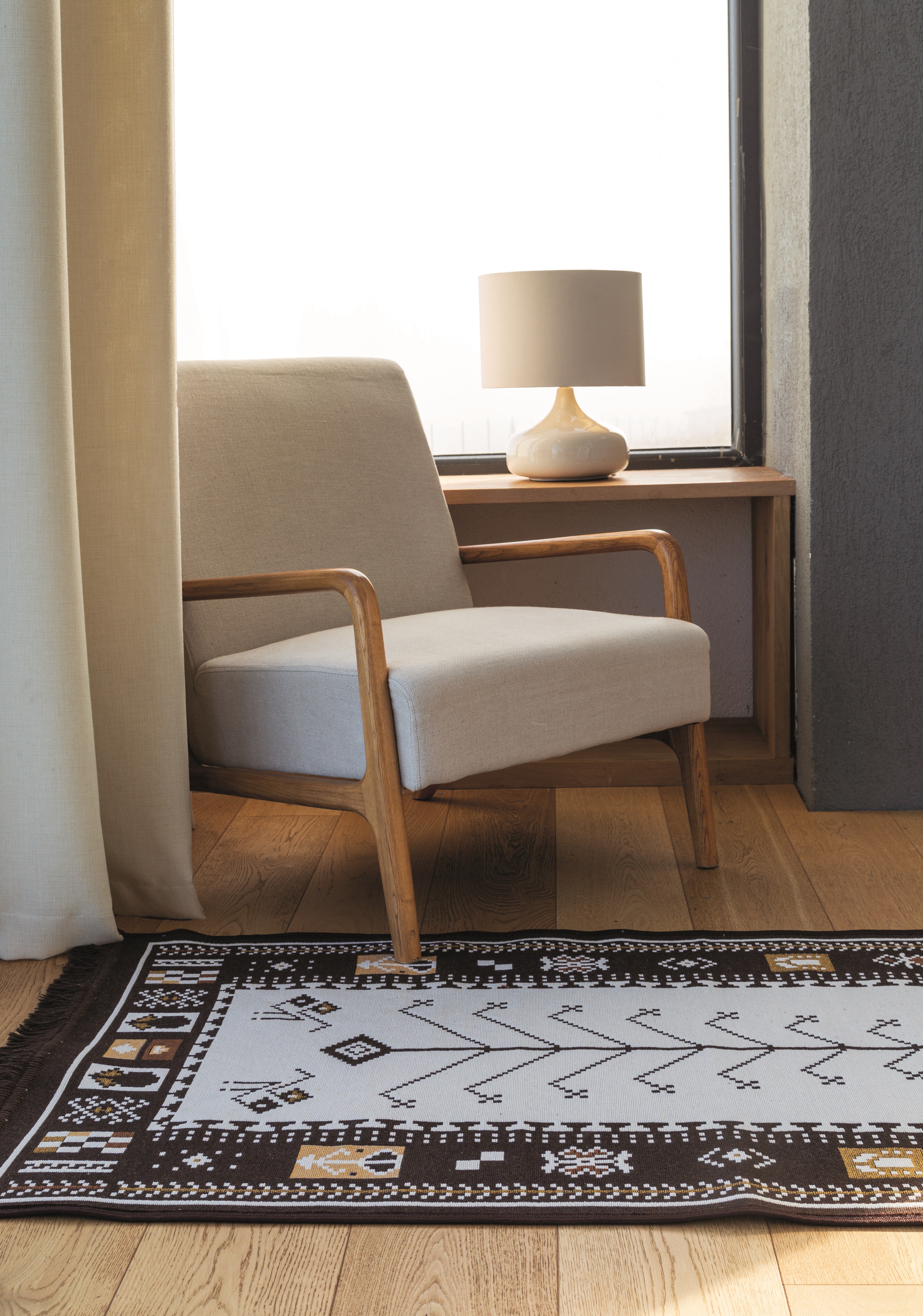 With a weight of 1150 GSM, this rug is suitable for all seasons and complements your living spaces beautifully. Whether used as a kitchen rug, hallway rug, patio rug, or living and dining room rug, it creates a warm atmosphere. Its fusion of vintage and Scandinavian design elements makes it compatible with various décor styles, offering versatility in its use.