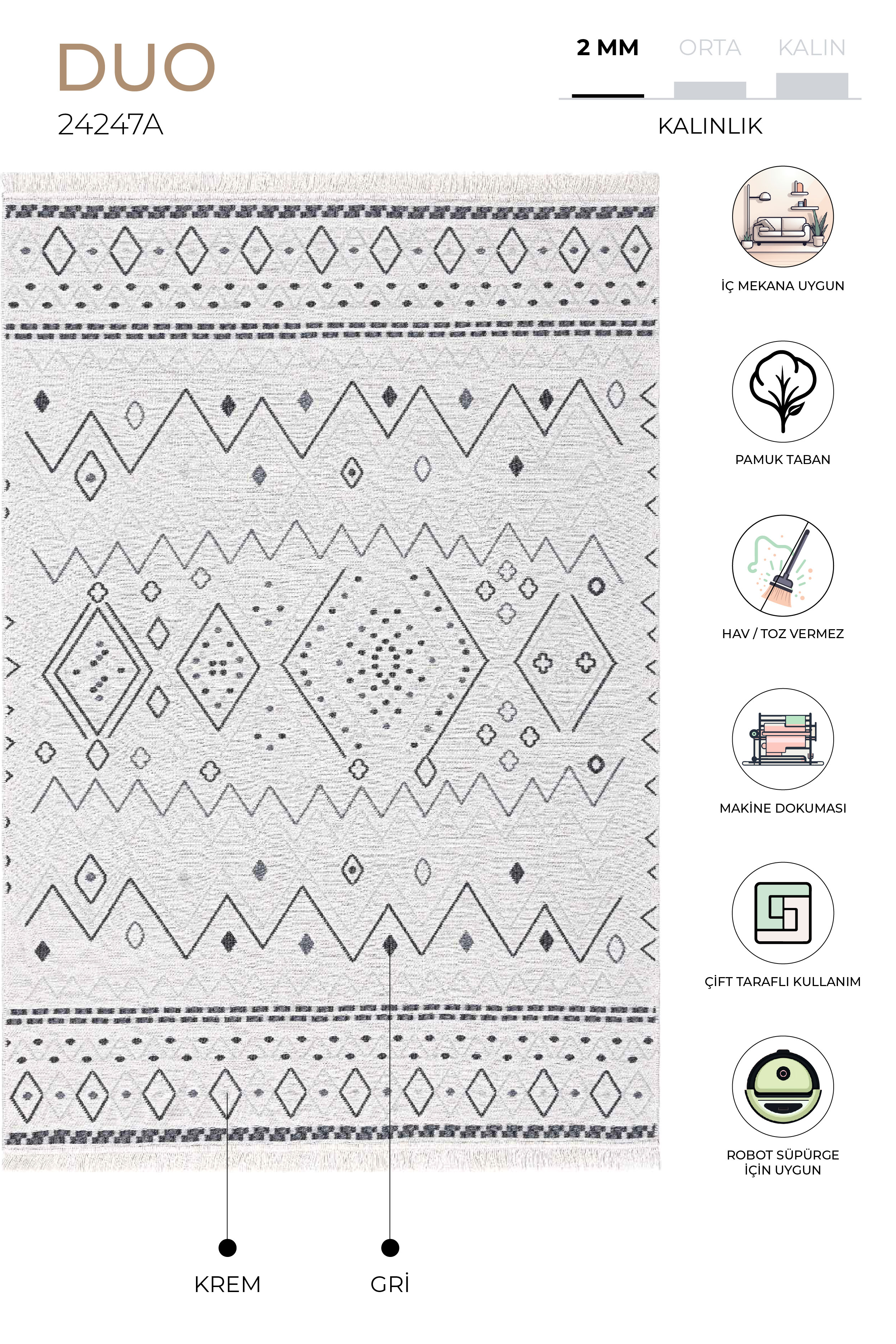 DUO PRODUCT FEATURES Add dimension to your living spaces with our Duo rugs, which blend the lines of the Scandinavian style with the harmonious unity of geometric shapes and can be used with different color designs on both sides. AREAS OF USAGE -Can be used in kitchen and balcony areas. MAINTENANCE AND CLEANING -Clean your rug daily with a brushed vacuum cleaner. Do not wipe with chemicals such as bleach, alcohol, etc. Do not wash it yourself, wipe it with a wet cloth and ventilate it. Sweep your rug in the direction of pile. Do not leave sharp, hard, heavy objects and items placed on the rug in the same place for a long time. When not in use, store your rug rolled up, away from moisture and vertically. Do not expose it to direct sunlight. The above reasons and stains during use exclude your rug from warranty. TECHNICAL INFORMATION -100% Cotton -195,000 knots/m2 -1300 gr/m2 SIZES 160x230 120x180 80x300 80x150 60x100