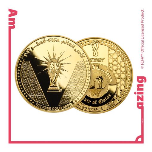 منتج مرخص رسميًا من الفيفا™️ عملة الذهب النقية 1 أونصة عيار 24 قيراط "الكأس". الحجم: 38.6 مم الوزن: 1 أونصة - 31.103 جرام تم الإصدار من قبل البنك المركزي القطري.