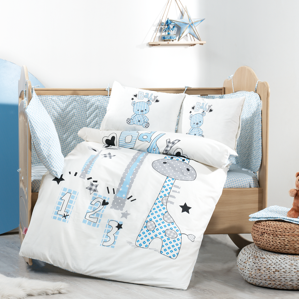 Buddy - Blue Duvet Cover Set Reflect your favorite style in your baby's room with the baby duvet cover set. Our duvet cover is made of 100% high quality and natural cotton yarn. Again, due to the use of long fiber fabric in its yarn, our baby duvet cover is durable and long-lasting. Our duvet cover allows your baby to sleep comfortably with its softness and texture in terms of fabric quality. It is friendly to your baby's skin and does not cause sweating. In addition, the model, which stands out with its soft and smooth sheet structure, offers a practical use by being easily fixed to the bed on which it will be laid. Let your baby's pure and innocent sleep accompany him while he sleeps in his room with the baby duvet cover set you choose. Baby Duvet Cover Set Package: 1 Duvet Cover, 1 Bed Sheet, 2 Pillow Cases. Production location: Turkey, Denizli. Washing Instructions: Wash your products in the machine or by hand with plenty of water on a gentle washing program at 400C. We recommend that you use colormatic detergent when washing. Iron the duvet cover sets with a warm iron. Do not leave the product wet. When washing, wash light and dark colors separately. Never use bleach or bleaching cleaning agents. Wash the products in your machine without squeezing them. It may deform when you compress it while full. Wash and dry the products that have been kept waiting for any reason before drying them. Do not dry your products at high temperatures. Wash and iron all parts of the duvet cover sets before use.