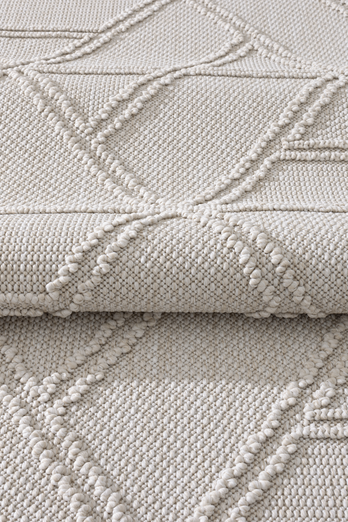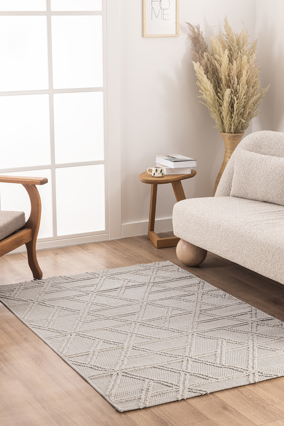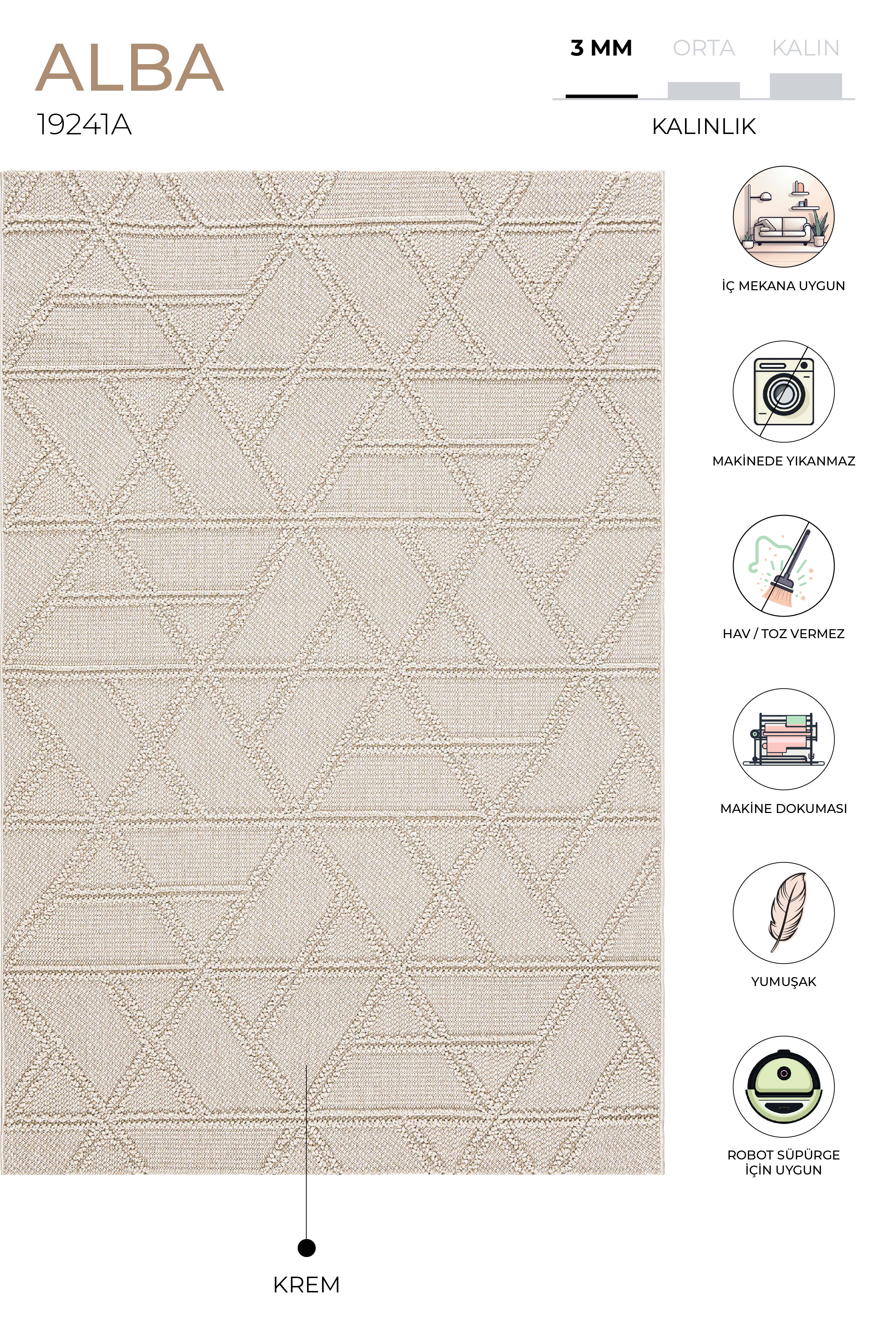 Alba Collection Alba Collection is made of high-quality polypropylene yarn and is a magnificent option that attracts attention with its rich texture. Alba carpet with 7 mm pile height and high-quality polypropylene content offers a soft and comfortable feeling under your feet. Alba Collection is carefully designed with soft color options and calm geometric patterns that complement any decor. This collection, which is also eye-catching in terms of aesthetics, is designed to add an elegant touch to your living spaces. Alba Collection has four different color options as cream beige, cream, gray cream and beige cream. Each pattern is enriched with carefully designed details, so you can create a unique atmosphere in your home or workplace. Ideal for those looking for decoration, comfort and elegance in living spaces. It is suitable for use in living rooms, living rooms and bedrooms indoors. The carpet perfectly adapts to any environment with its soft tones of cream and beige. This carpet brings dynamism and freshness to your room while also creating a bright accent on the floor. With its stylish design and high-quality materials, it provides both a visually pleasing appearance and offers long-lasting use. Create an elegant and stylish environment and beautify your space with its minimalist and modern look. Enrich your decor, comfort and ambiance with Alba, designed to add style to your living spaces. Alba Collection is a perfect option for long-term use thanks to its durable structure, offering long-lasting and easy maintenance. It does not cause dust and fluff. It can be washed in carpet washing service. It is not recommended to use bleach and heavy chemicals. A damp cloth and carpet cleaner can be used for stain care. It is suitable for robot vacuum cleaner use. Note: Actual colors may differ depending on lighting and monitor settings. There may be up to 5% difference in the dimensions of carpets due to the variety of production and yarn used.