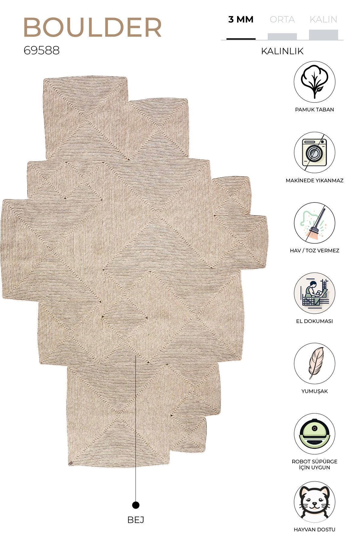 Designed in an amorphous style, the Boulder Collection goes beyond classic carpet sizes and forms and is made of a special yarn that is resistant to water and sun with its uniquely shaped structure. Durable and suitable for many years of use. Areas of use: It is a functional carpet that you can use in any corner of your home with its unique structure. Suitable for pet areas. Washing instructions: Do not machine wash. Wipe gently with a damp cloth.