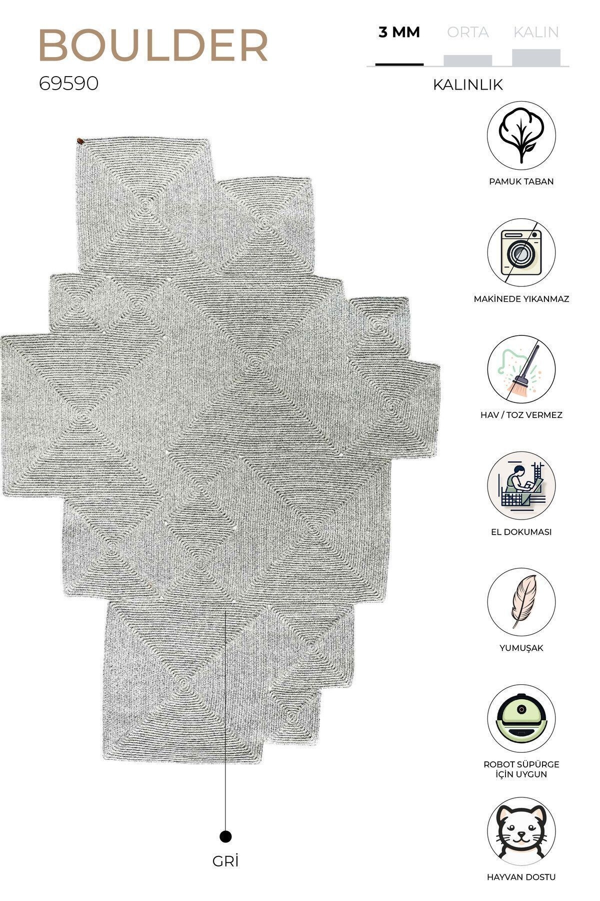 Designed in an amorphous style, the Boulder Collection goes beyond classic carpet sizes and forms and is made of a special yarn that is resistant to water and sun with its uniquely shaped structure. Durable and suitable for many years of use. Areas of use: It is a functional carpet that you can use in any corner of your home with its unique structure. Suitable for pet areas. Washing instructions: Do not machine wash. Wipe gently with a damp cloth.