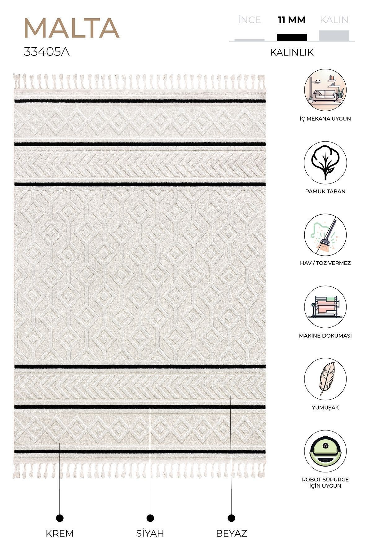 MALTA We are here with the Malta Collection, a versatile complement to your living spaces. Malta carpet with 11 mm thickness and high quality polyester content has a cotton base coating that increases strength. Malta Collection is carefully designed with soft color options and calm linear patterns that complement all kinds of decor. Our Malta series, where Scandinavian lines meet the balanced spirit of the beach, was created with the luxurious appearance of peaceful neutral colors. It has a rich product range with different size and color options. It is ideal for those looking for decoration, comfort and elegance in living spaces. It is suitable for use in living rooms, living rooms and bedrooms in interior spaces. The carpet perfectly adapts to any environment with its soft tones of cream color. This carpet brings dynamism and freshness to your room while also creating a bright accent on the floor. With its stylish design and high quality materials, it provides both a visually pleasing appearance and offers long-lasting use. Beautify your space with its minimalist and modern appearance by creating an elegant and stylish environment. Enrich your decor, comfort and ambiance with Malta, designed to add style to your living spaces. It does not cause dust and fluff. It can be washed in carpet washing service. It is not recommended to use bleach and heavy chemicals. A damp cloth and carpet cleaner can be used for stain care. It is suitable for robot vacuum cleaner use. Note: Actual colors may vary depending on lighting and monitor settings. There may be up to 5% difference in dimensions due to the variety of production and yarn used in carpets. 80x80 100x100 120x120 160x160 200x200 Dimensions are round carpets.