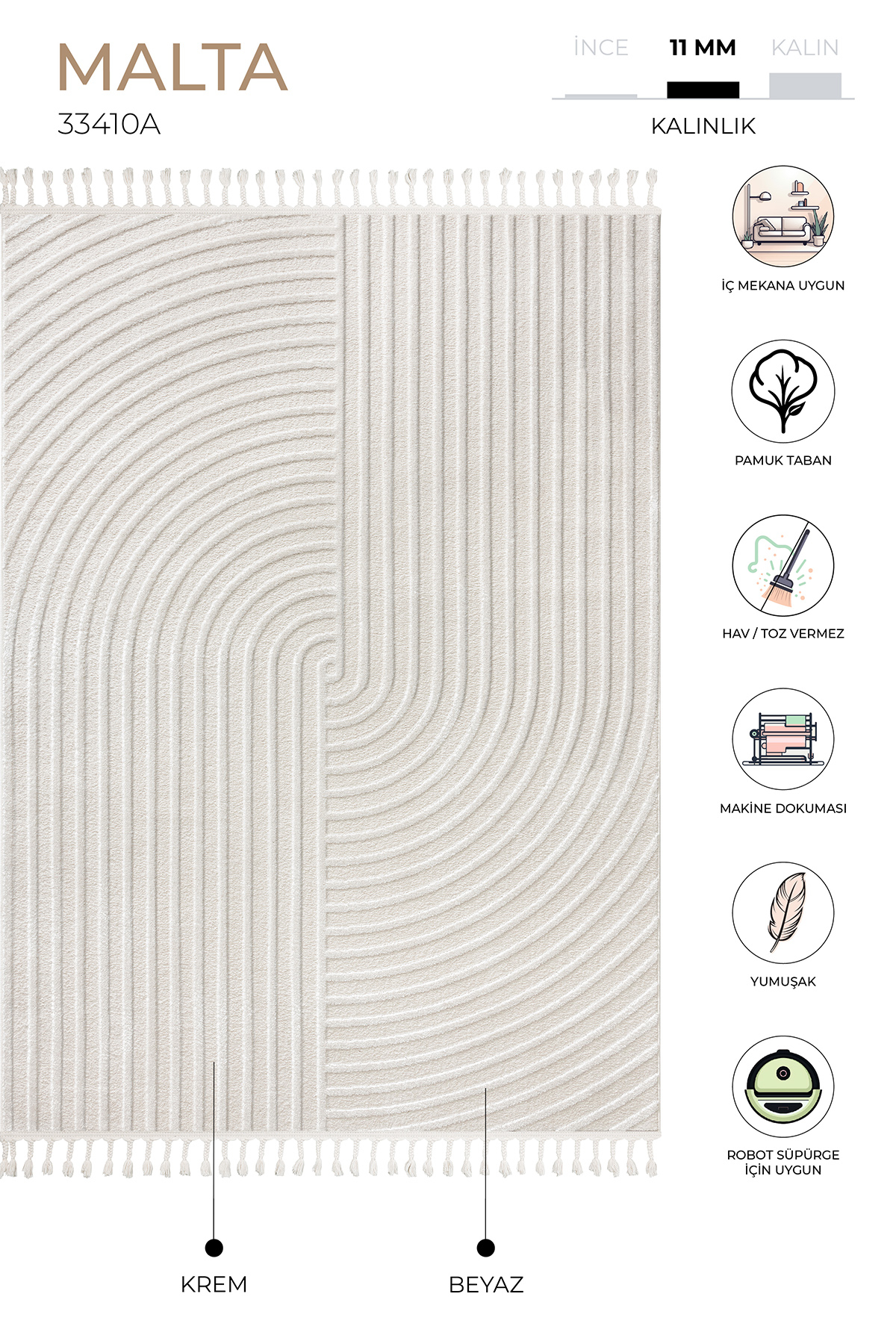 MALTA We are here with the Malta Collection, a versatile complement to your living spaces. Malta carpet with 11 mm thickness and high quality polyester content has a cotton base coating that increases strength. Malta Collection is carefully designed with soft color options and calm linear patterns that complement all kinds of decor. Our Malta series, where Scandinavian lines meet the balanced spirit of the beach, was created with the luxurious appearance of peaceful neutral colors. It has a rich product range with different size and color options. It is ideal for those looking for decoration, comfort and elegance in living spaces. It is suitable for use in living rooms, living rooms and bedrooms in interior spaces. The carpet perfectly adapts to any environment with its soft tones of cream color. This carpet brings dynamism and freshness to your room while also creating a bright accent on the floor. With its stylish design and high quality materials, it provides both a visually pleasing appearance and offers long-lasting use. Beautify your space with its minimalist and modern appearance by creating an elegant and stylish environment. Enrich your decor, comfort and ambiance with Malta, designed to add style to your living spaces. It does not cause dust and fluff. It can be washed in carpet washing service. It is not recommended to use bleach and heavy chemicals. A damp cloth and carpet cleaner can be used for stain care. It is suitable for robot vacuum cleaner use. Note: Actual colors may vary depending on lighting and monitor settings. There may be up to 5% difference in dimensions due to the variety of production and yarn used in carpets. 80x80 100x100 120x120 160x160 200x200 Dimensions are round carpets.