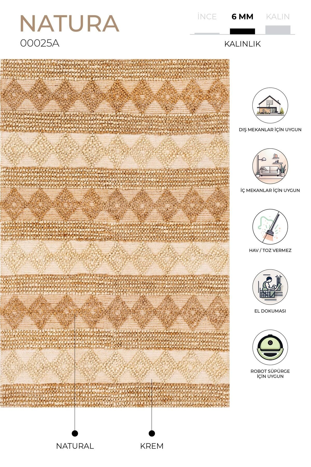 NATURA JUTE is produced in India from natural jute fibers on a handloom. Jute rugs are hand-woven, special rugs made of natural yarn that suit almost every style of decoration. They are recyclable, do not harm the ecological balance and are environmentally friendly. They are durable and are not affected by time, trends and trend wear. It carries the simplicity of natural textures to the environment with its natural jute and cream weave details. It has details that will add movement to your space with its diamond-patterned and embossed weave. It is available in size options such as 90x150, 120x180, 160x240 and 200x290 cm. Natura Rug has a minimal, modern plain weave design that complements every kind of decor. It is suitable for both indoor and outdoor use, is resistant to UV rays, is resistant to moisture and mold, and is easy to clean and maintain. Ideal for those looking for decoration, comfort and elegance in living spaces. It is perfect for outdoor spaces, gardens and any area where you need durable and stylish floor coverings. The carpet perfectly adapts to any environment with its calm and natural tone. Create an elegant and stylish environment and beautify your space with its minimalist and modern look. Due to the natural state of plants, color differences, color transitions, stains at some points and various differences in the body of the plant are reflected in the product as well. Again, there may be very small plus/minus differences in the measurements of handmade products. It should be wiped with a damp cloth. Note: Actual colors may vary depending on lighting and monitor settings.