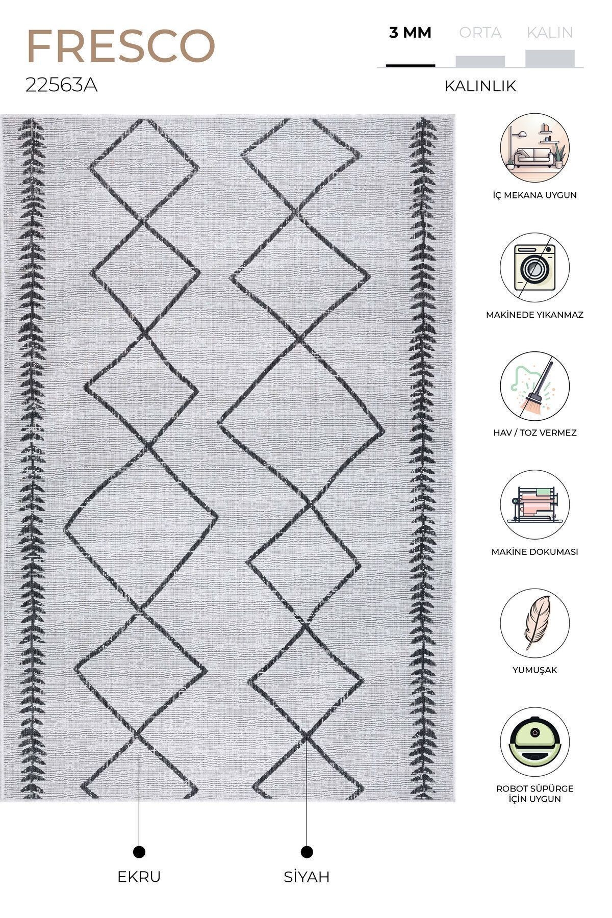 Fresco PRODUCT FEATURES Our Illusion quality produced using polypropylene; It is produced with 96,000 points loop density with Koza Halı technology. HOW IS IT MADE? It is produced on high-speed computer-controlled machine looms using polypropylene on modern Koza Halı looms; It is highly stain resistant, long-lasting, durable and resistant to color fading. TECHNICAL INFORMATION -Polypropylene -96,000 points -1,200gr/m2 USAGE AREAS -Can be used on balconies, terraces, entrances and kitchen areas. MAINTENANCE AND CLEANING -Can be washed in carpet washing service. Clean your carpet daily with a brushed vacuum cleaner. Do not wipe with chemicals such as bleach, alcohol, etc. Do not wash it yourself, wipe it with a wet cloth and ventilate it. Sweep your carpet in the direction of pile. Do not leave sharp, hard, heavy objects and items placed on the carpet in the same place for a long time. When not in use, store your carpet rolled up and away from moisture and vertically. Do not expose it to direct sunlight. The above reasons and stains during use exclude your carpet from the warranty.