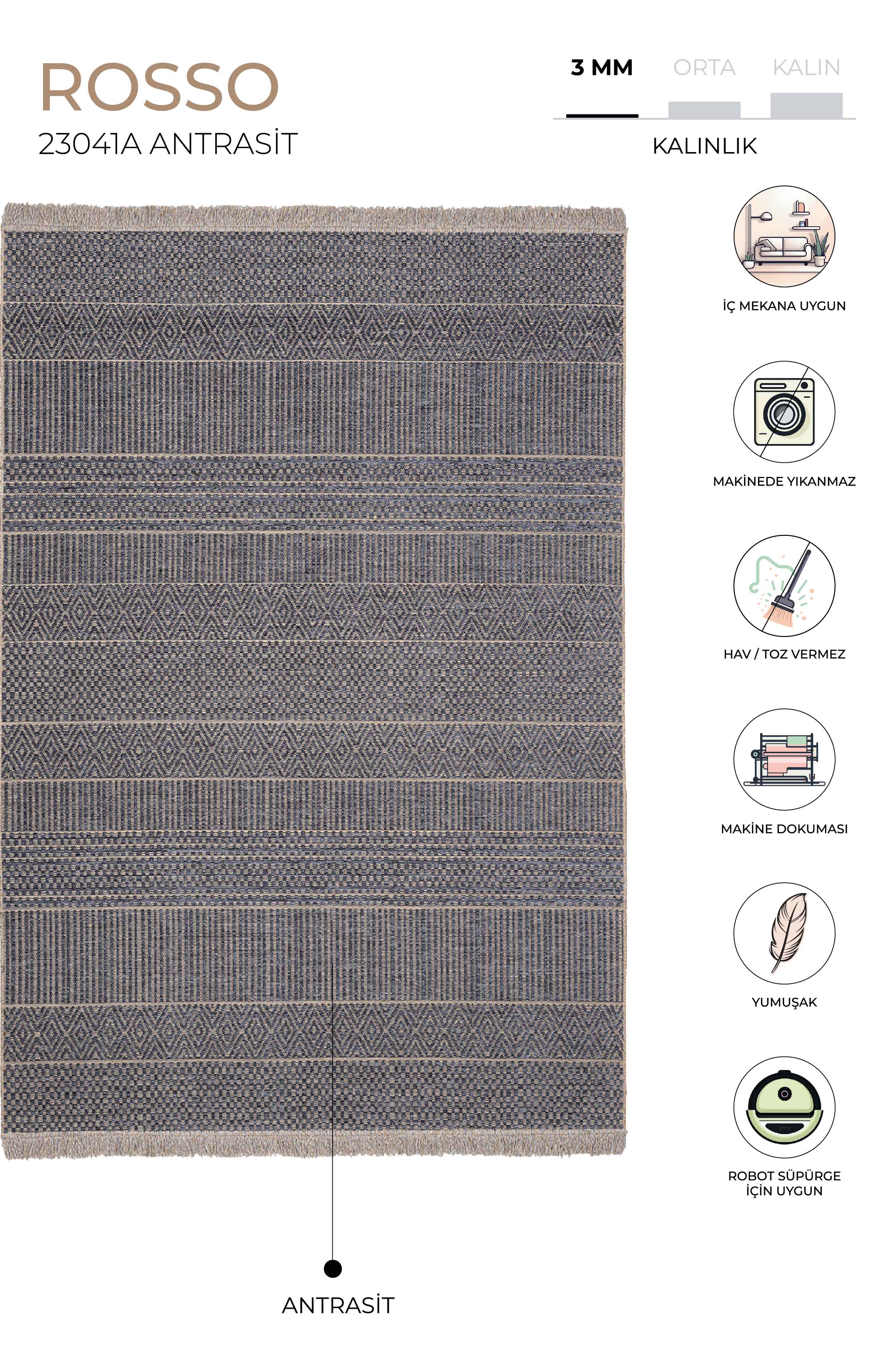 ROSSO PRODUCT FEATURES Our Rosso collection is a jute rug and is produced with Koza Halı technology using jute and polyester chenille with a density of 130,000 knots. HOW IS IT MADE? It is produced on high-speed computer-controlled machine looms using jute and polyester chenille on modern Koza Halı looms; It is highly stain resistant, long-lasting, durable and resistant to color fading. TECHNICAL INFORMATION -130,000 knots -1900 gr/m2 USAGE AREAS -Can be used in living room, kitchen and balcony areas. MAINTENANCE AND CLEANING Clean your rug daily with a brushed vacuum cleaner. Do not wipe with chemicals such as bleach, alcohol, etc. Do not wash it yourself, wipe it with a wet cloth and ventilate it. Sweep your rug in the direction of pile. Do not leave sharp, hard, heavy objects and items placed on the rug in the same place for a long time. When not in use, store your carpet in a rolled up position, away from humidity and vertically. Do not expose it to direct sunlight. The above reasons and stains during use exclude your carpet from the warranty.