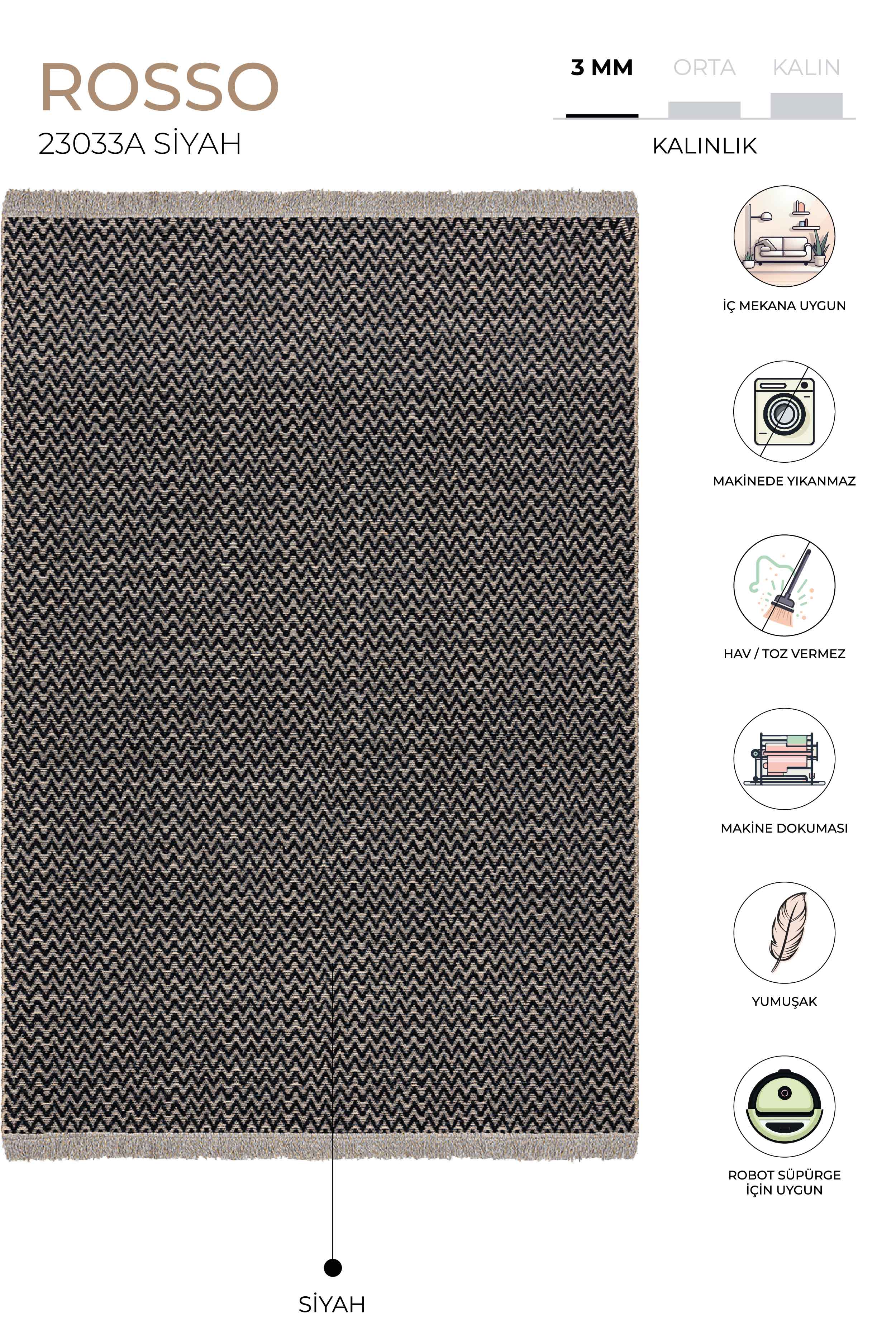 ROSSO PRODUCT FEATURES Our Rosso collection is a jute rug and is produced with Koza Halı technology using jute and polyester chenille with a density of 130,000 knots. HOW IS IT MADE? It is produced on high-speed computer-controlled machine looms using jute and polyester chenille on modern Koza Halı looms; It is highly stain resistant, long-lasting, durable and resistant to color fading. TECHNICAL INFORMATION -130,000 knots -1900 gr/m2 USAGE AREAS -Can be used in living room, kitchen and balcony areas. MAINTENANCE AND CLEANING Clean your rug daily with a brushed vacuum cleaner. Do not wipe with chemicals such as bleach, alcohol, etc. Do not wash it yourself, wipe it with a wet cloth and ventilate it. Sweep your rug in the direction of pile. Do not leave sharp, hard, heavy objects and items placed on the rug in the same place for a long time. When not in use, store your carpet in a rolled up position, away from humidity and vertically. Do not expose it to direct sunlight. The above reasons and stains during use exclude your carpet from the warranty.
