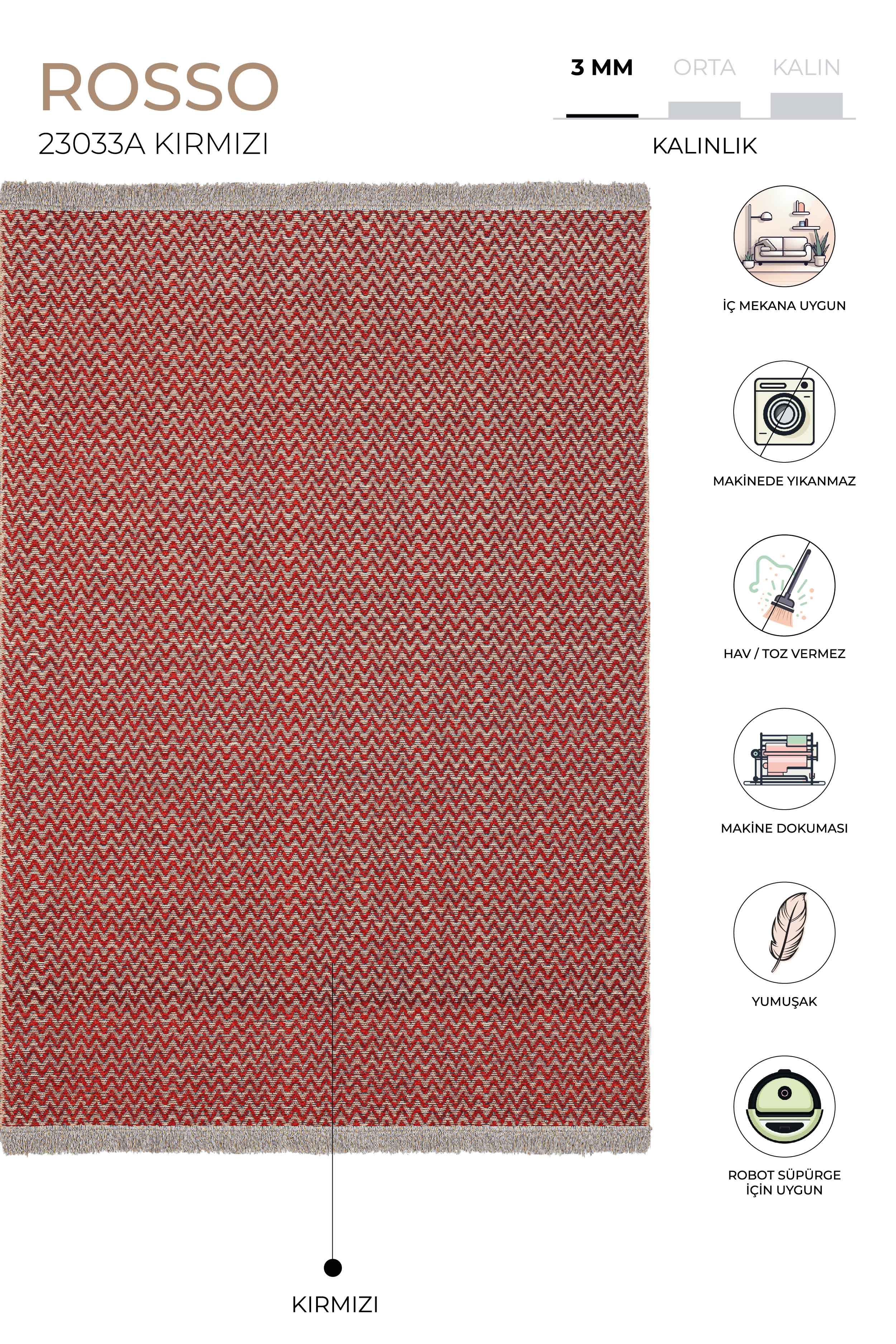 ROSSO PRODUCT FEATURES Our Rosso collection is a jute rug and is produced with Koza Halı technology using jute and polyester chenille with a density of 130,000 knots. HOW IS IT MADE? It is produced on high-speed computer-controlled machine looms using jute and polyester chenille on modern Koza Halı looms; It is highly stain resistant, long-lasting, durable and resistant to color fading. TECHNICAL INFORMATION -130,000 knots -1900 gr/m2 USAGE AREAS -Can be used in living room, kitchen and balcony areas. MAINTENANCE AND CLEANING Clean your rug daily with a brushed vacuum cleaner. Do not wipe with chemicals such as bleach, alcohol, etc. Do not wash it yourself, wipe it with a wet cloth and ventilate it. Sweep your rug in the direction of pile. Do not leave sharp, hard, heavy objects and items placed on the rug in the same place for a long time. When not in use, store your carpet in a rolled up position, away from humidity and vertically. Do not expose it to direct sunlight. The above reasons and stains during use exclude your carpet from the warranty.