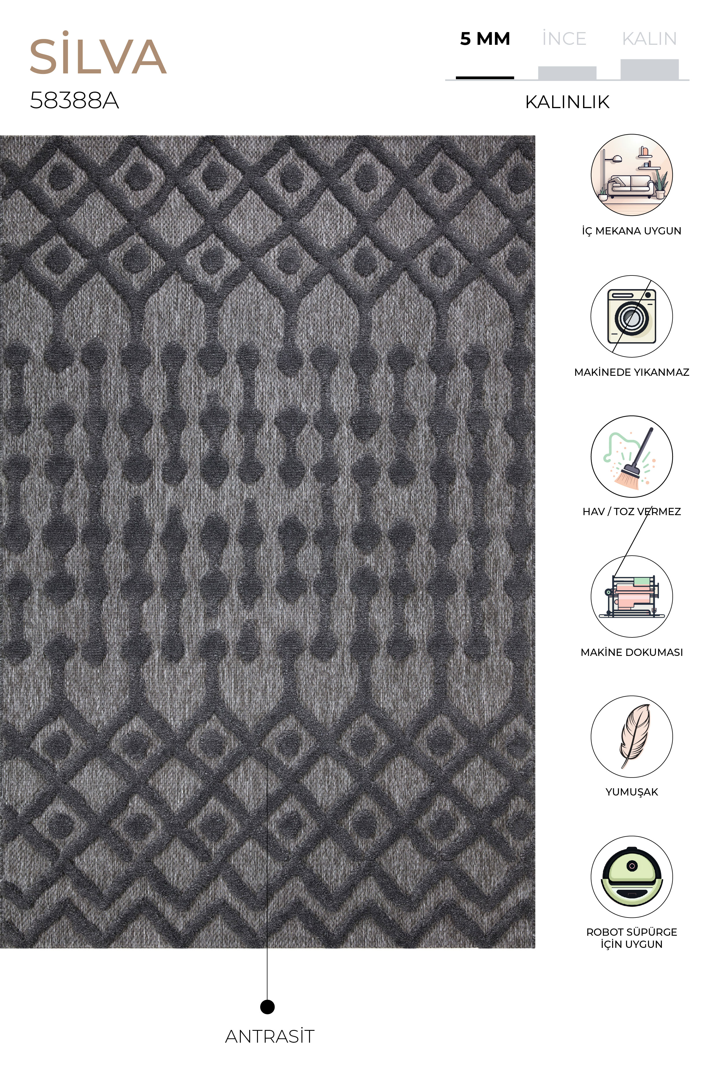SILVA Product description: It is produced with Koza Halı technology on high-speed computer-controlled machine looms with 180,000 knots of polypropylene with a geometric pattern application that gives a modern and dynamic effect to the design, and is highly stain resistant, long-lasting, durable and resistant to color fading. Our Silva carpets offer a user-friendly, comfortable design with their double-layered structure that does not shed, adding a contemporary and modern texture to spaces with natural color transitions. Silva Collection, which stands out with Koza Halı's special design, adds elegance to your spaces with its modern aesthetics and durable structure. Areas of use: It can be used in living rooms, kitchens, balconies and children's rooms. Washing Instructions: Clean your carpet with a daily brushed vacuum cleaner. Do not wipe with chemicals such as bleach, alcohol, etc. Do not wash it yourself, wipe it with a wet cloth and air it. Vacuum your carpet in the direction of the nap.