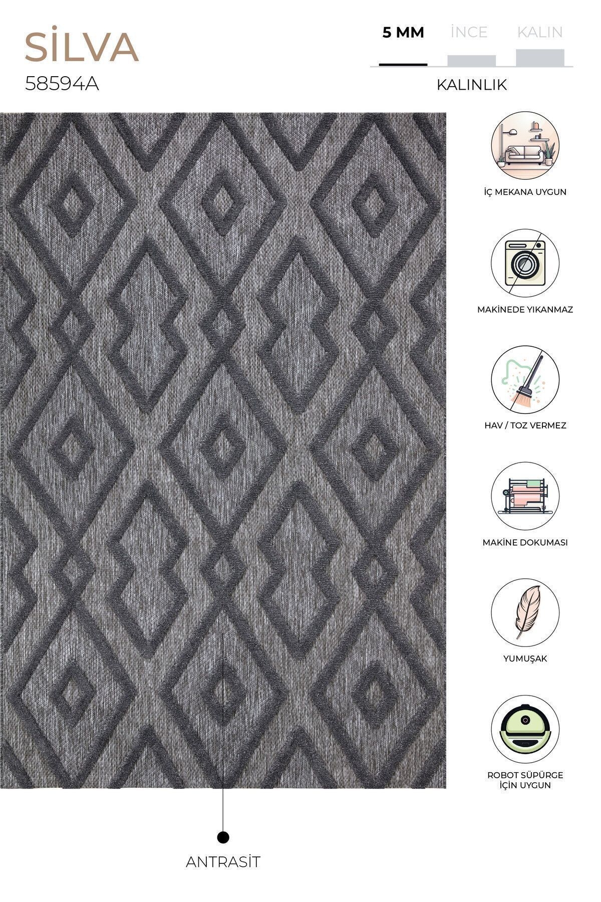 - Koza Halı Silva Anthracite Carpet Washable Carpet Balcony Carpet Living Room Hallway Bedroom Carpet 58594A 80 x 50