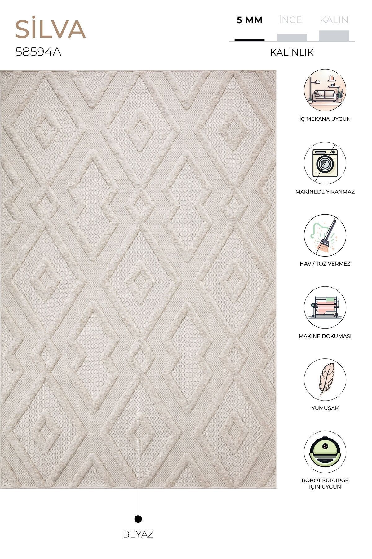 - Koza Halı Silva White Carpet Washable Carpet Balcony Carpet Living Room Hallway Bedroom Carpet 58594A 200 x 290