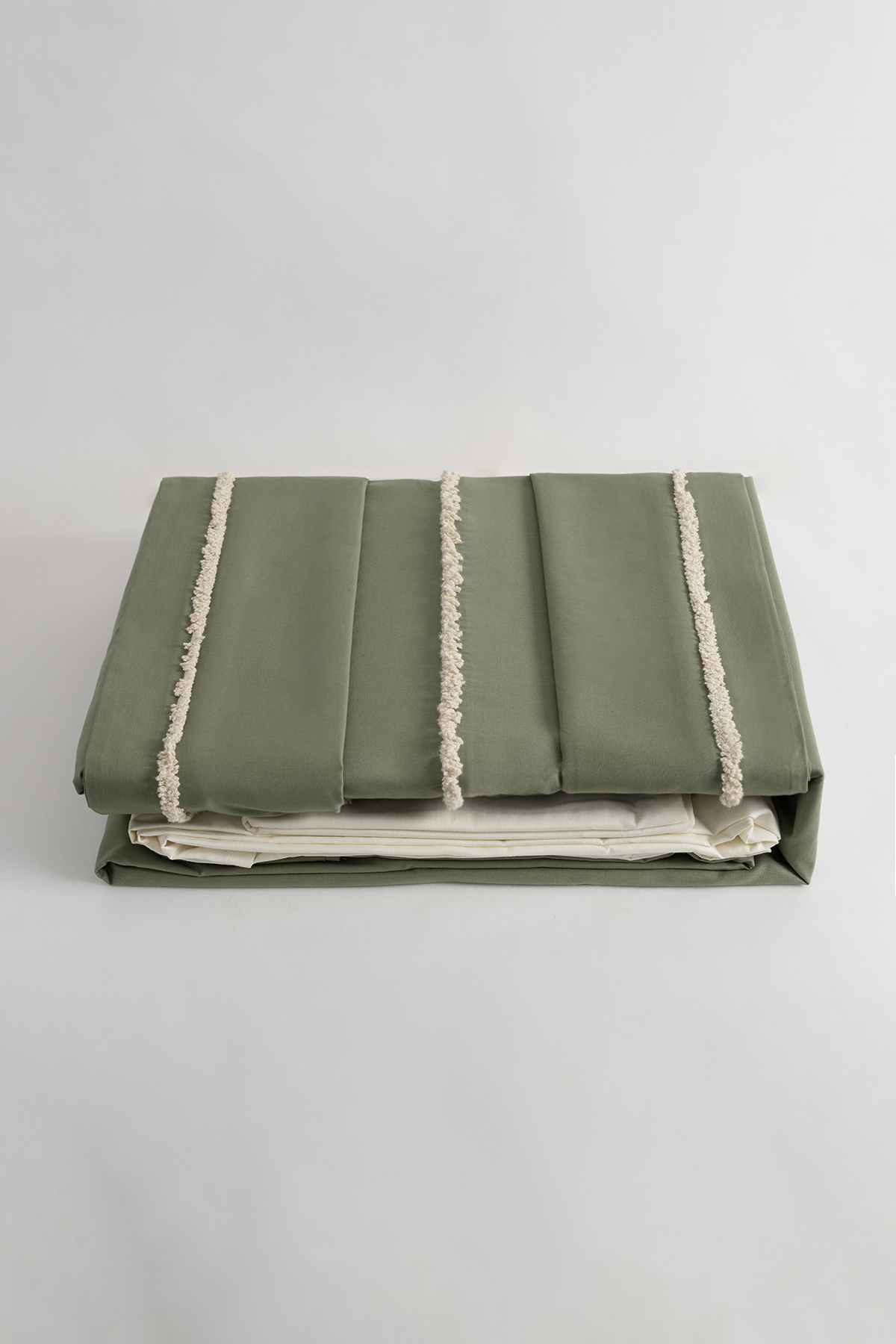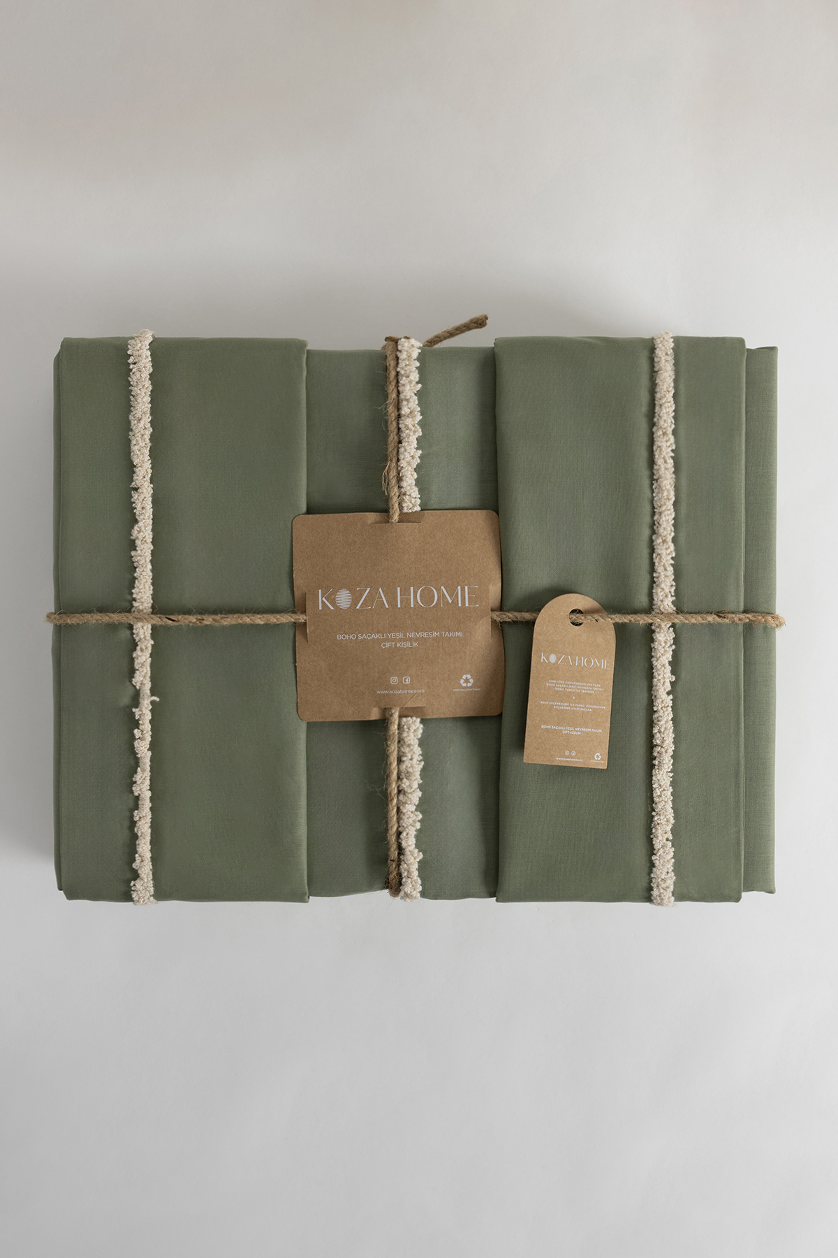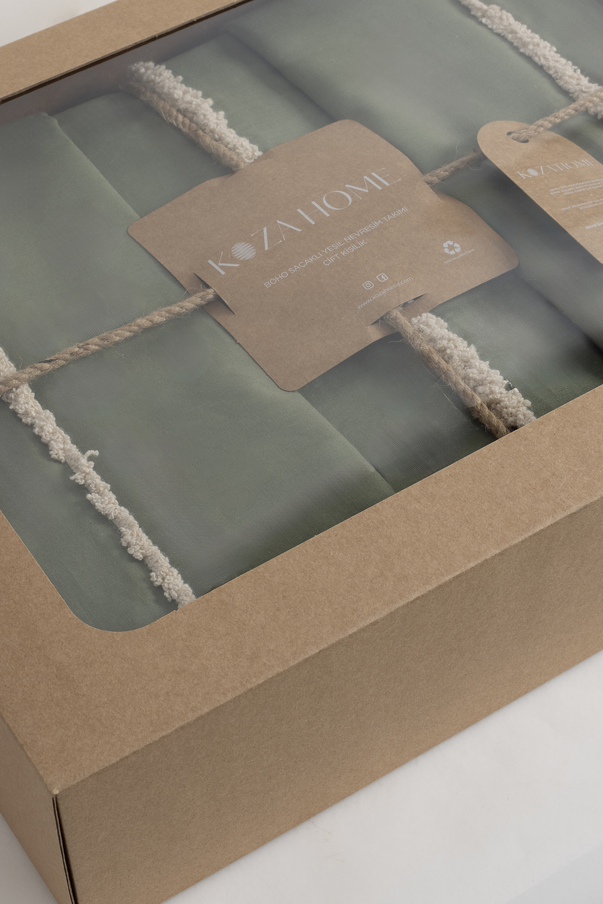 Boho Fringed Green Duvet Cover Set Double 200 x 220 7030A Boho Fringed Duvet Cover Set is designed to add an elegant atmosphere to your bedroom and balance elegance. Enriched with blue and green color options, this set has a size of 200x220 cm ideal for double beds. It also includes a 240x260 cm fitted sheet and 4 pieces of 50x70 pillowcases, offering a complete bed dressing set. Boho Fringed Duvet Cover Set combines elegance and comfort while decorating the bedroom with its simple and minimalist design. It offers a perfect option for those looking for aesthetics and functionality, and at the same time provides a soft and peaceful sleeping experience with its 100% cotton content. It renews your bedroom, allows you to forget your daily stress and fall into a comfortable night's sleep. It will be the right choice for those looking for a bohemian decoration element with cream fringe details. Care Recommendation Delicate wash at 30 degrees. To preserve the quality of the fabric, avoid washing with harsh chemicals such as bleach or alcohol. Bleaching is not allowed. Line drying is recommended. Dry cleaning is not recommended. Note: Actual colors may vary depending on lighting and monitor settings.