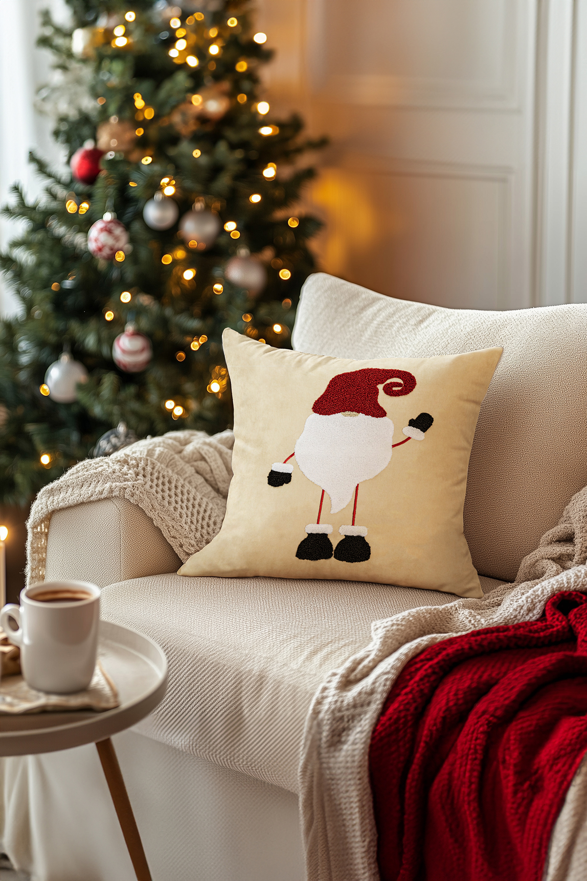Charm Santa Claus Punch Embroidery Beige Cushion 43X43 35251A Charm Santa Claus Punch Embroidery Beige Cushion is a perfect choice to bring the Christmas spirit to your home. This 43x43 cm cushion stands out with its colorful Santa Claus motif carefully embroidered on a beige background. Its soft and durable 100% polyester fabric provides a comfortable seating area and is suitable for long-term use. The colorful Santa Claus figure, carefully prepared with the punch embroidery technique, adds a warm atmosphere to your living room, bedroom or guest area by completing your New Year-themed decorations. It offers practical use with its easy-to-clean structure. This stylish and fun cushion enriches your New Year decorations while also bringing joy to your home as a comfortable decorative element. You can wash the cover in a delicate program at 30 degrees. You can dry it by spreading it out. Avoid using bleach.