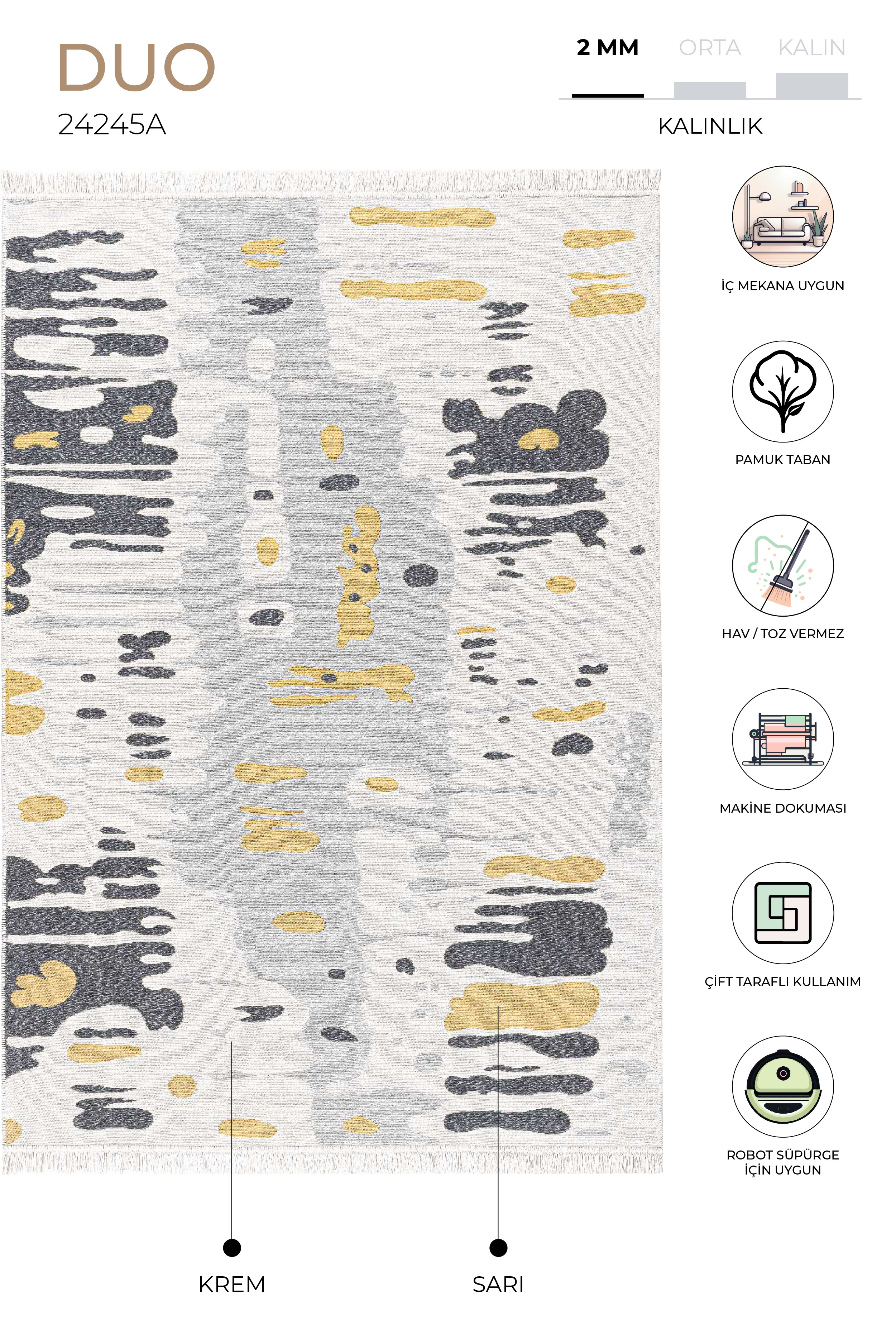 DUO PRODUCT FEATURES Add dimension to your living spaces with our Duo rugs, which blend the lines of the Scandinavian style with the harmonious unity of geometric shapes and can be used with different color designs on both sides. AREAS OF USAGE -Can be used in kitchen and balcony areas. MAINTENANCE AND CLEANING -Clean your rug daily with a brushed vacuum cleaner. Do not wipe with chemicals such as bleach, alcohol, etc. Do not wash it yourself, wipe it with a wet cloth and ventilate it. Sweep your rug in the direction of pile. Do not leave sharp, hard, heavy objects and items placed on the rug in the same place for a long time. When not in use, store your rug rolled up, away from moisture and vertically. Do not expose it to direct sunlight. The above reasons and stains during use exclude your rug from warranty. TECHNICAL INFORMATION -100% Cotton -195,000 knots/m2 -1300 gr/m2 SIZES 160x230 120x180 80x300 80x150 60x100