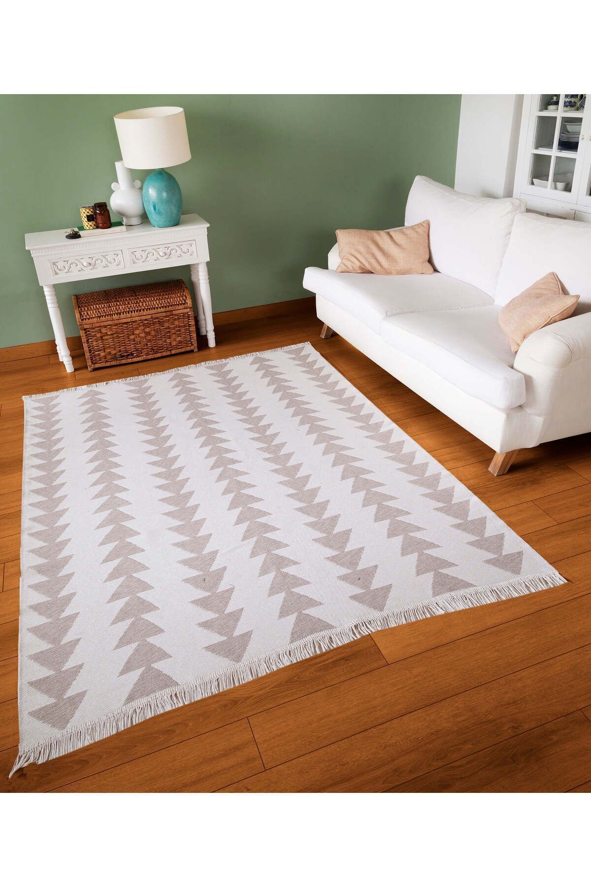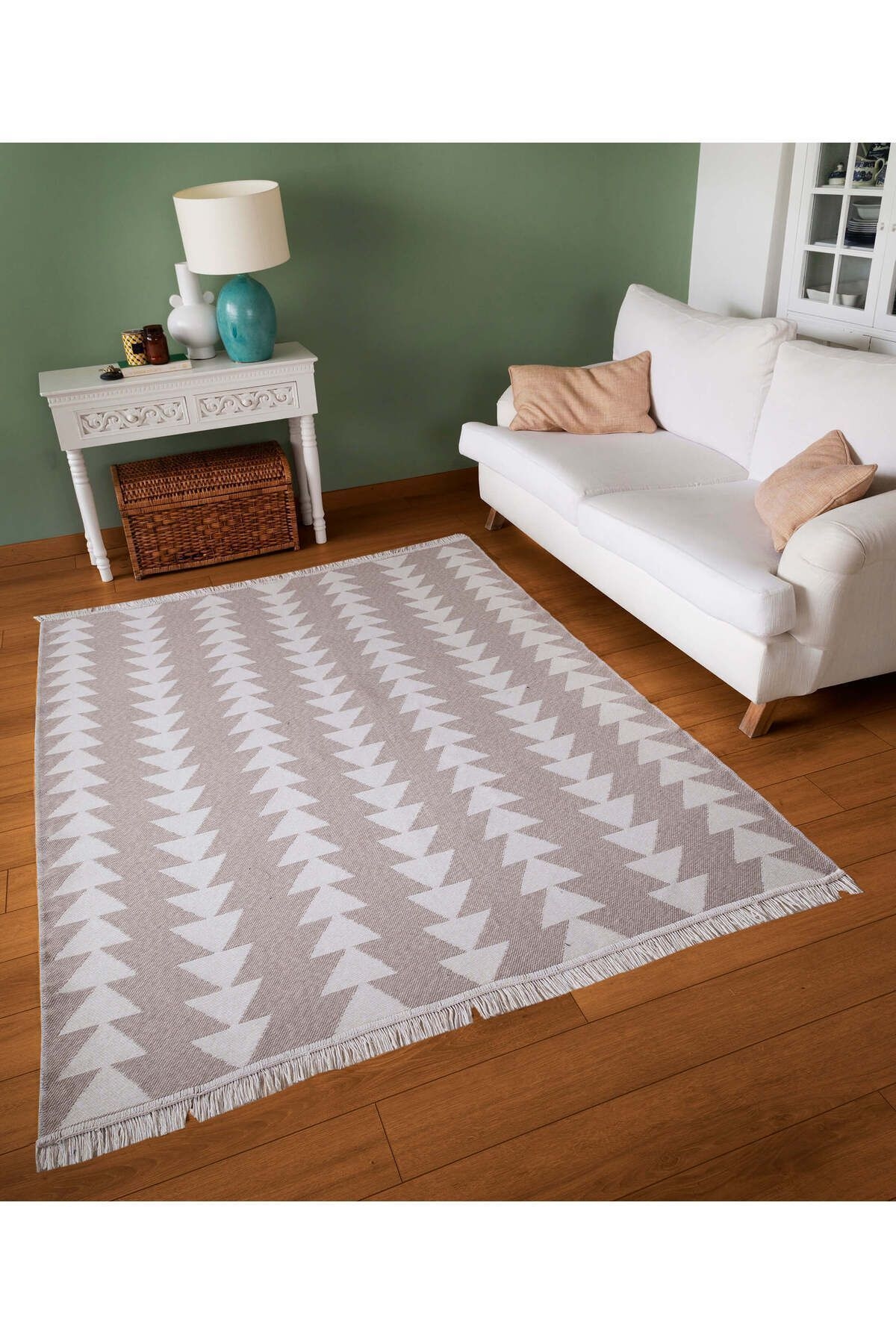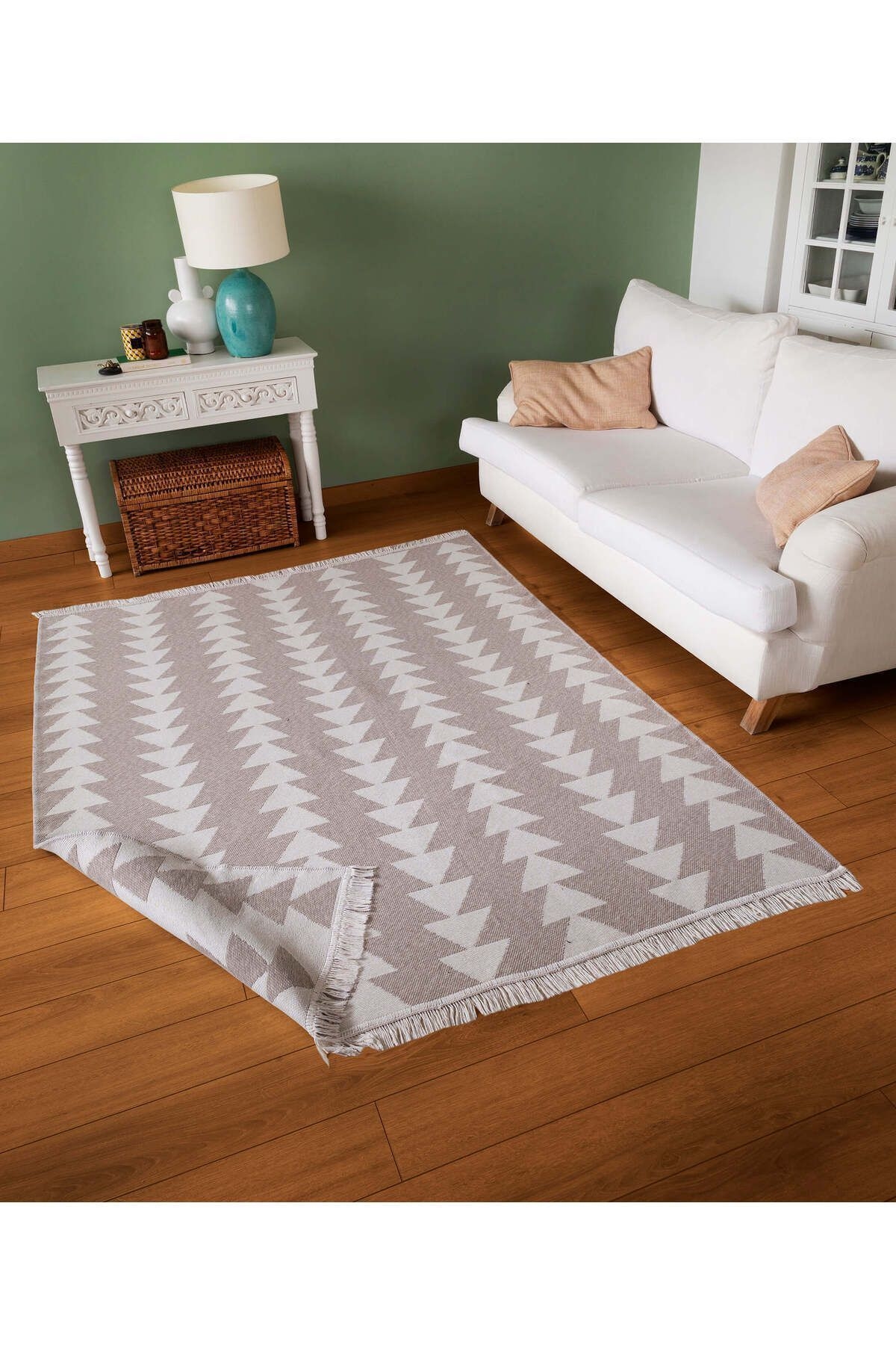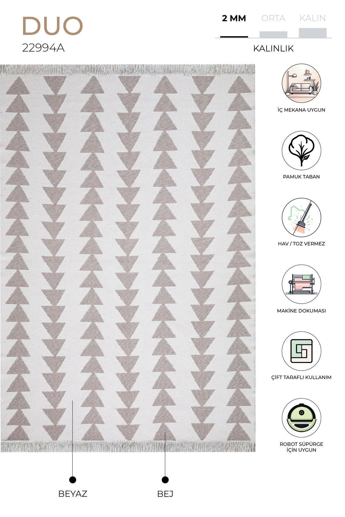 DUO PRODUCT FEATURES Add dimension to your living spaces with our Duo rugs, which blend the lines of the Scandinavian style with the harmonious unity of geometric shapes and can be used with different color designs on both sides. AREAS OF USAGE -Can be used in kitchen and balcony areas. MAINTENANCE AND CLEANING -Clean your rug daily with a brushed vacuum cleaner. Do not wipe with chemicals such as bleach, alcohol, etc. Do not wash it yourself, wipe it with a wet cloth and ventilate it. Sweep your rug in the direction of pile. Do not leave sharp, hard, heavy objects and items placed on the rug in the same place for a long time. When not in use, store your rug rolled up, away from moisture and vertically. Do not expose it to direct sunlight. The above reasons and stains during use exclude your rug from warranty. TECHNICAL INFORMATION -100% Cotton -195,000 knots/m2 -1300 gr/m2 SIZES 160x230 120x180 80x300 80x150 60x100