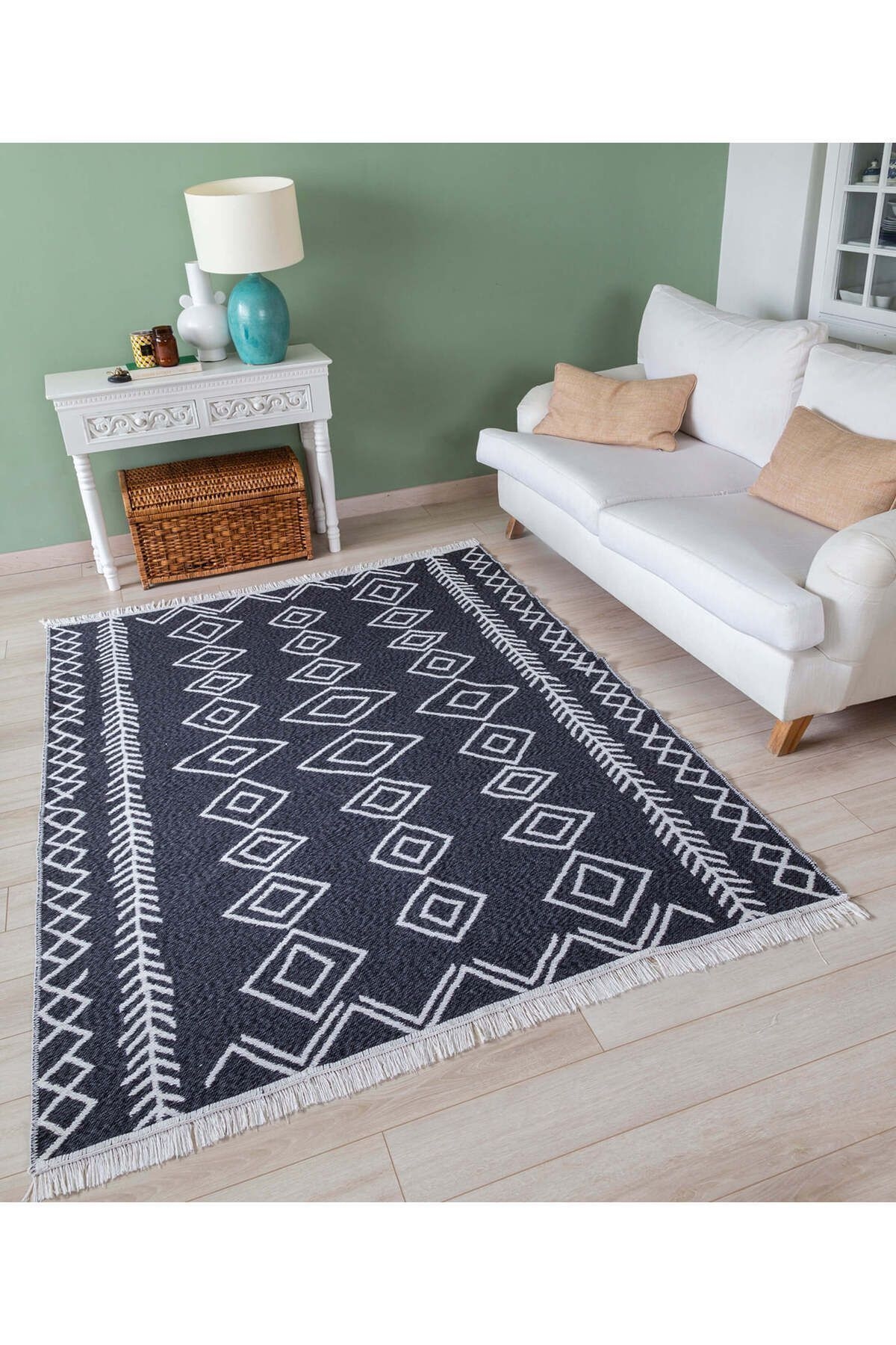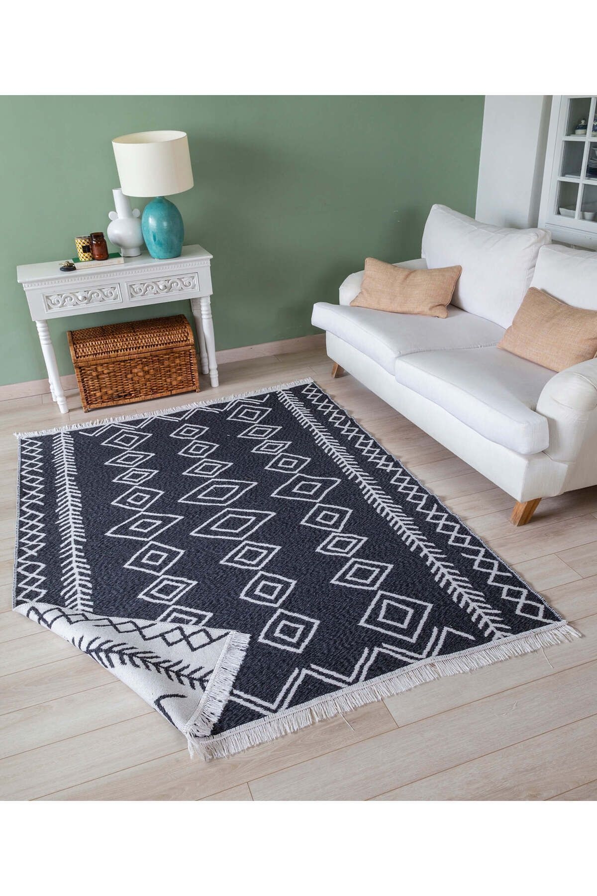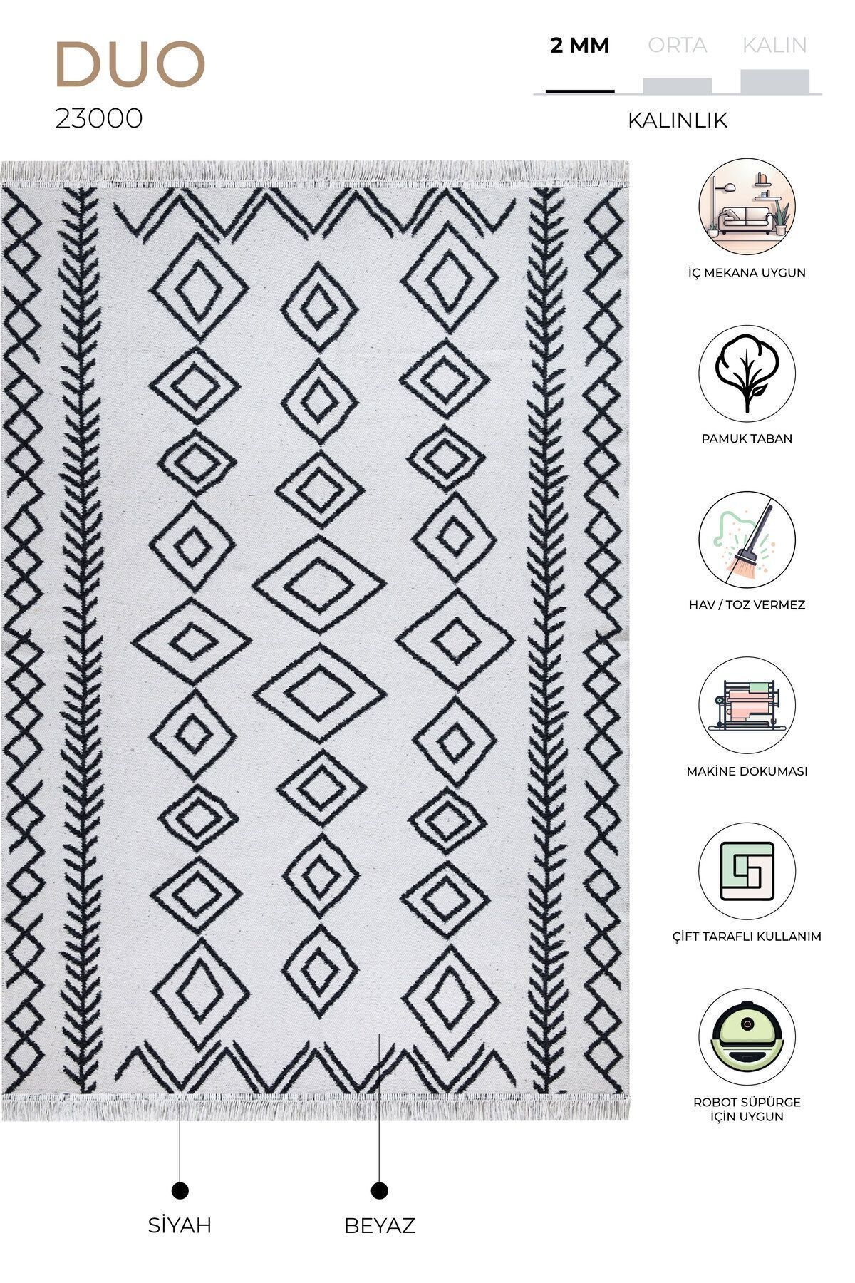DUO PRODUCT FEATURES Add dimension to your living spaces with our Duo rugs, which blend the lines of the Scandinavian style with the harmonious unity of geometric shapes and can be used with different color designs on both sides. AREAS OF USAGE -Can be used in kitchen and balcony areas. MAINTENANCE AND CLEANING -Clean your rug daily with a brushed vacuum cleaner. Do not wipe with chemicals such as bleach, alcohol, etc. Do not wash it yourself, wipe it with a wet cloth and ventilate it. Sweep your rug in the direction of pile. Do not leave sharp, hard, heavy objects and items placed on the rug in the same place for a long time. When not in use, store your rug rolled up, away from moisture and vertically. Do not expose it to direct sunlight. The above reasons and stains during use exclude your rug from warranty. TECHNICAL INFORMATION -100% Cotton -195,000 knots/m2 -1300 gr/m2 SIZES 160x230 120x180 80x300 80x150 60x100