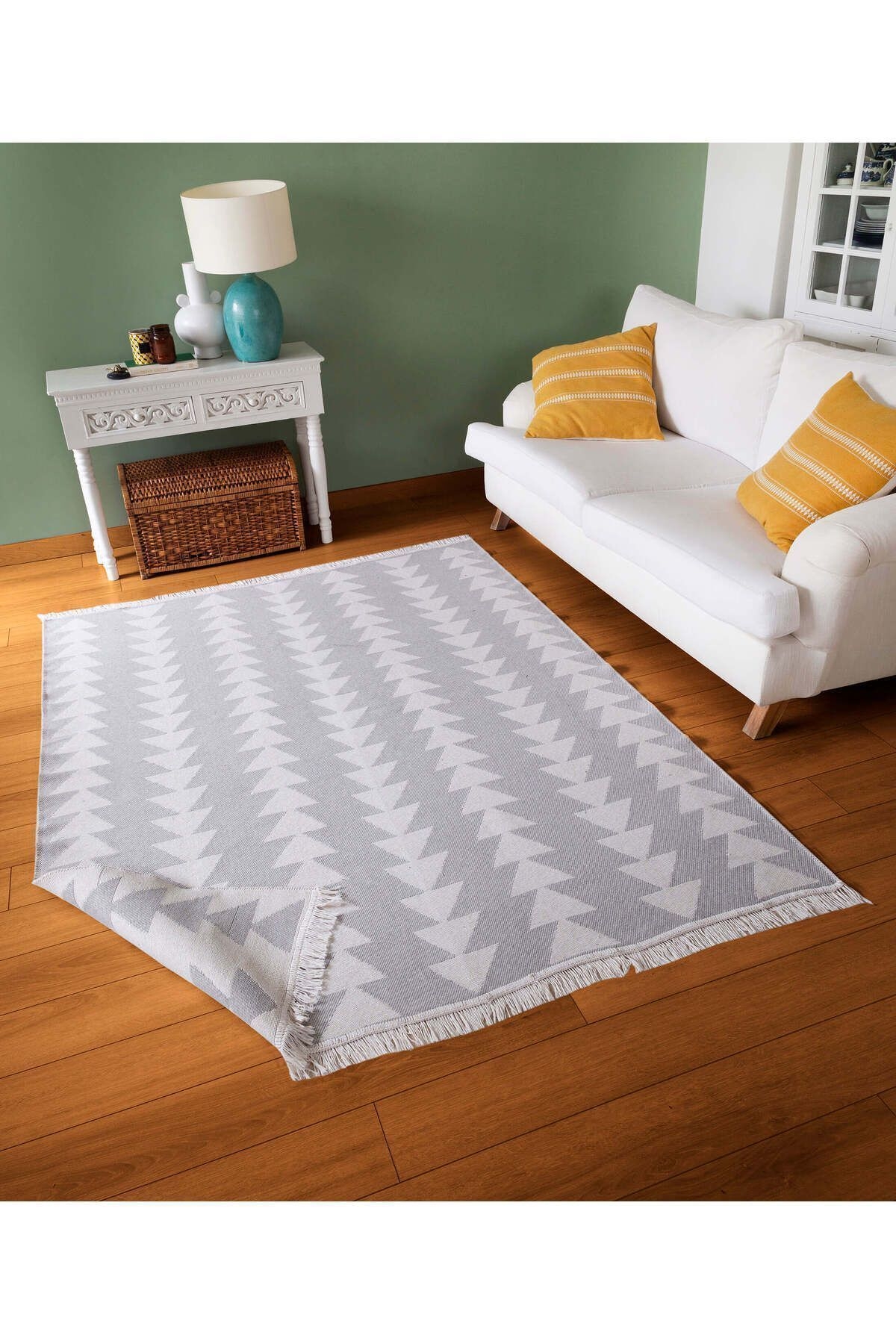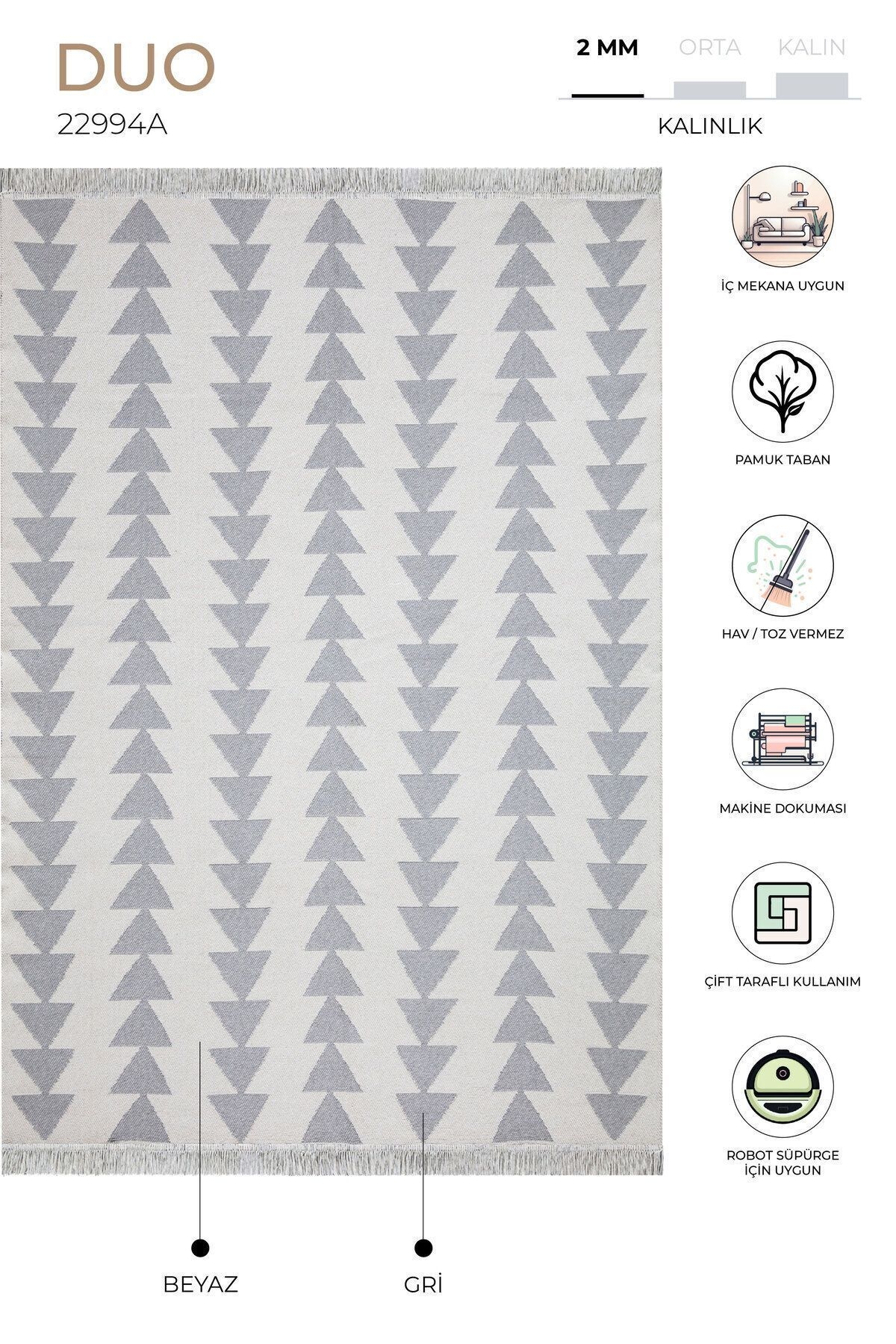 DUO PRODUCT FEATURES Add dimension to your living spaces with our Duo rugs, which blend the lines of the Scandinavian style with the harmonious unity of geometric shapes and can be used with different color designs on both sides. AREAS OF USAGE -Can be used in kitchen and balcony areas. MAINTENANCE AND CLEANING -Clean your rug daily with a brushed vacuum cleaner. Do not wipe with chemicals such as bleach, alcohol, etc. Do not wash it yourself, wipe it with a wet cloth and ventilate it. Sweep your rug in the direction of pile. Do not leave sharp, hard, heavy objects and items placed on the rug in the same place for a long time. When not in use, store your rug rolled up, away from moisture and vertically. Do not expose it to direct sunlight. The above reasons and stains during use exclude your rug from warranty. TECHNICAL INFORMATION -100% Cotton -195,000 knots/m2 -1300 gr/m2 SIZES 160x230 120x180 80x300 80x150 60x100