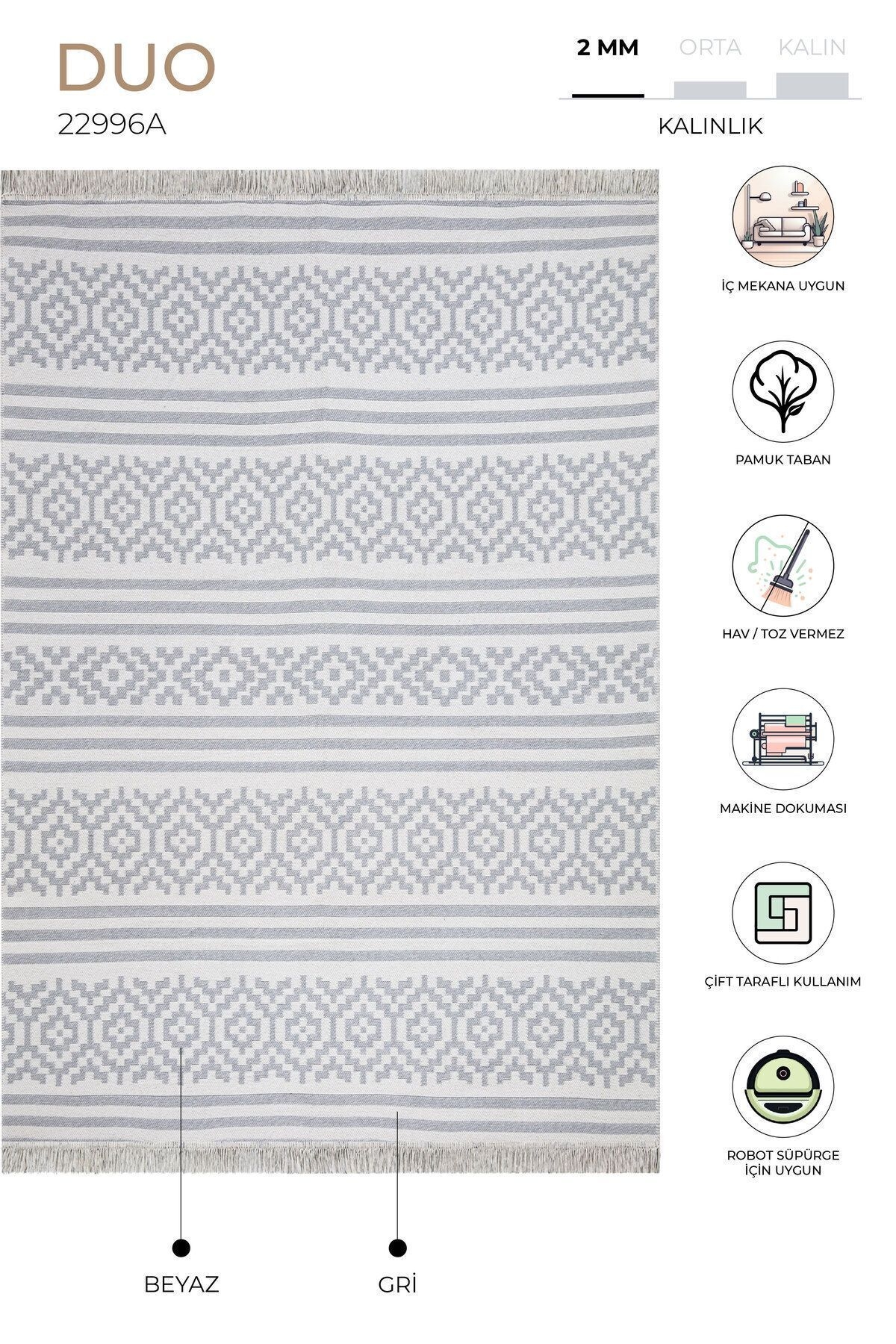 DUO PRODUCT FEATURES Add dimension to your living spaces with our Duo rugs, which blend the lines of the Scandinavian style with the harmonious unity of geometric shapes and can be used with different color designs on both sides. AREAS OF USAGE -Can be used in kitchen and balcony areas. MAINTENANCE AND CLEANING -Clean your rug daily with a brushed vacuum cleaner. Do not wipe with chemicals such as bleach, alcohol, etc. Do not wash it yourself, wipe it with a wet cloth and ventilate it. Sweep your rug in the direction of pile. Do not leave sharp, hard, heavy objects and items placed on the rug in the same place for a long time. When not in use, store your rug rolled up, away from moisture and vertically. Do not expose it to direct sunlight. The above reasons and stains during use exclude your rug from warranty. TECHNICAL INFORMATION -100% Cotton -195,000 knots/m2 -1300 gr/m2 SIZES 160x230 120x180 80x300 80x150 60x100