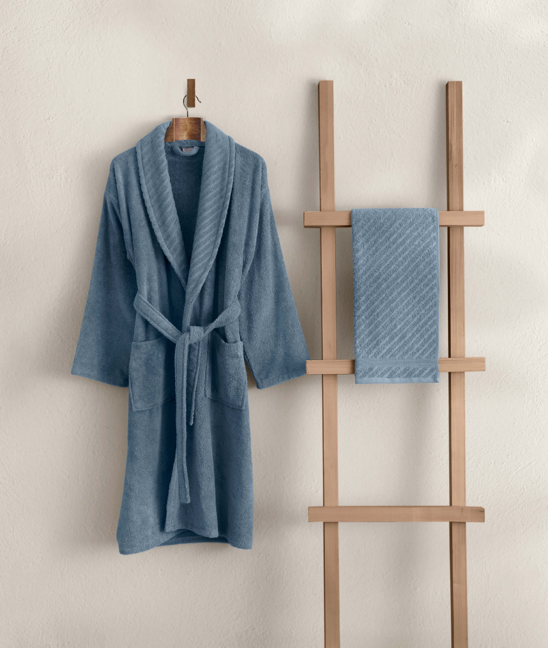 Koza Home Likya 100% Cotton Blue Dowry Bathrobe Set of 2 1 Bathrobe 1 Towel 1051A SM