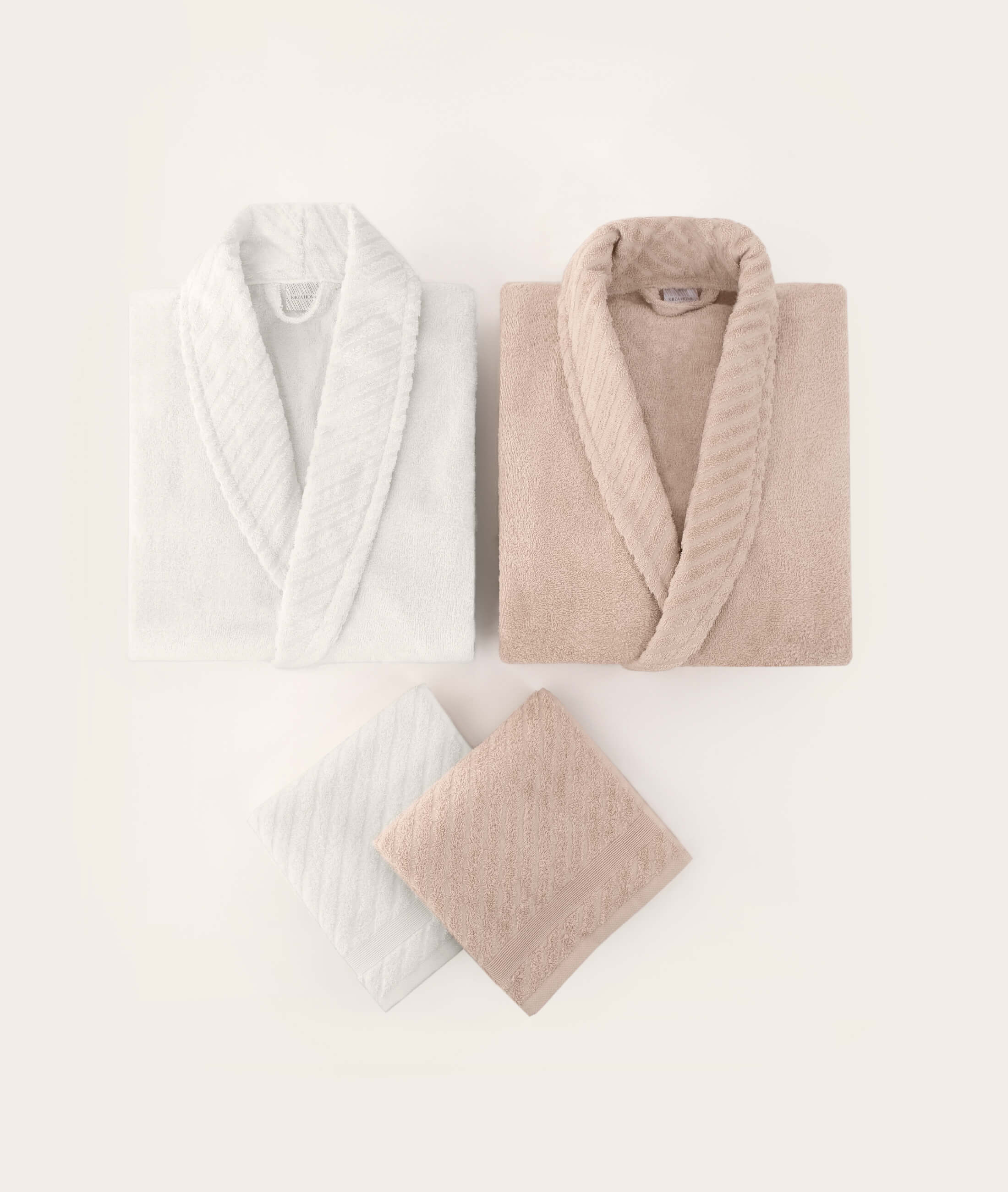 Likya bathrobe brings Mediterranean freshness to your bathroom with its 100% cotton structure, 5 different color options, jacquard collar and 2 size options. Our bathrobes, which are sold in 3 different categories as single bathrobe, double set and quadruple set, provide a natural touch to your skin and reach a softer texture with washing. 100% Cotton 5 different color options Jacquard collar Size SM, Size L-XL