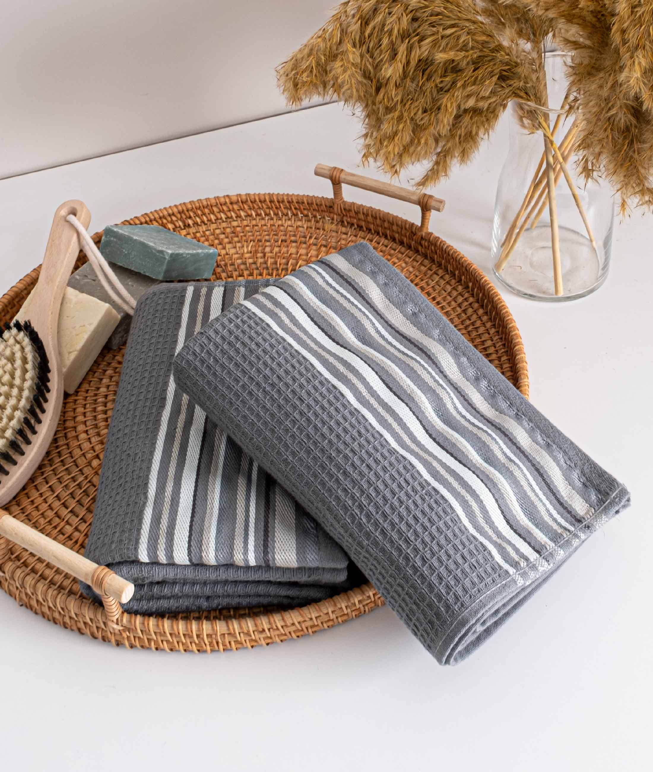 It stands out with its gofre textured cotton fabric and linear tone transitions. The color palette in pastel tones adapts to different decorations. It is ideal for drying hands and faces with its 50x90 dimensions. It offers a soft and comfortable use, and relaxes with the comfort of natural cotton. It provides a stylish look and functional use in your bathrooms. It provides a good drying experience and dries quickly thanks to its absorbent structure. Be sure to wash in the washing machine at 30°. Do not use bleach or detergent with bleach properties. Avoid washing with harsh chemicals such as bleach or alcohol to preserve the quality of the fabric. Drying by spreading is recommended. During the drying process, avoid exposure to direct sunlight to prevent possible fabric damage. Note: Actual colors may vary depending on lighting and monitor settings.