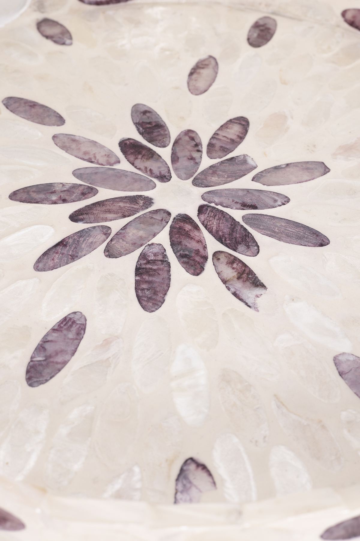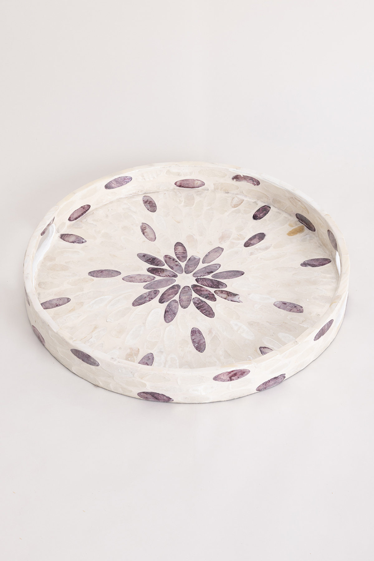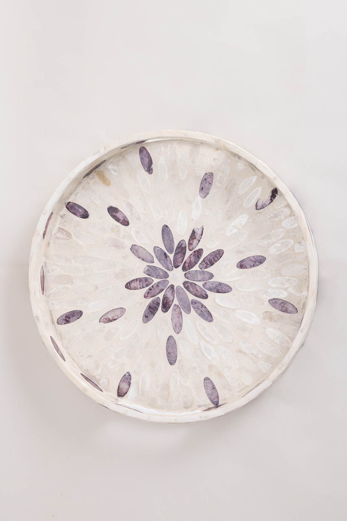 Meander Claret Red Detailed White Mother-of-Pearl Tray 30x3.5 cm 4322 Meander Claret Red Detailed Mother-of-Pearl Mosaic Tray displays the harmony of natural mother-of-pearl color with burgundy mother-of-pearl drop patterns, while capturing an authentic elegance far from the ordinary. It reveals the magnificent harmony of burgundy and natural mother-of-pearl tones by thinly cutting and gluing natural mother-of-pearl. This circular tray with a diameter of 30 cm has an elegant and functional design. The usage areas of this handmade tray are endless. It is a perfect choice for home decoration enthusiasts. You can add a natural atmosphere to your space by using it as a candle or accessory tray on the table or coffee table. It is also an ideal option for serving your meals or snacks in the kitchen. Each one is unique with its handmade details. Meander Claret Red Detailed Mother-of-Pearl Mosaic Tray brings functionality and aesthetics together, creating an elegant touch to your living space. Products made from natural materials are collected in their natural environment, naturally, and are produced by handcraft without any processing for the sake of a perfect appearance or using any molds to obtain a fixed size. Again, there may inevitably be very small plus/minus differences in the measurements of handmade products. Note: Actual colors may vary depending on lighting and monitor settings.