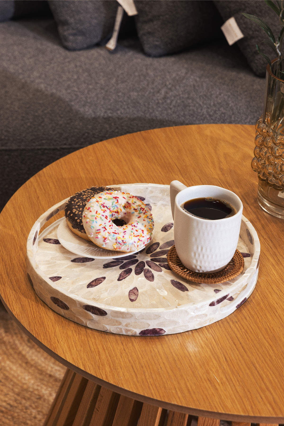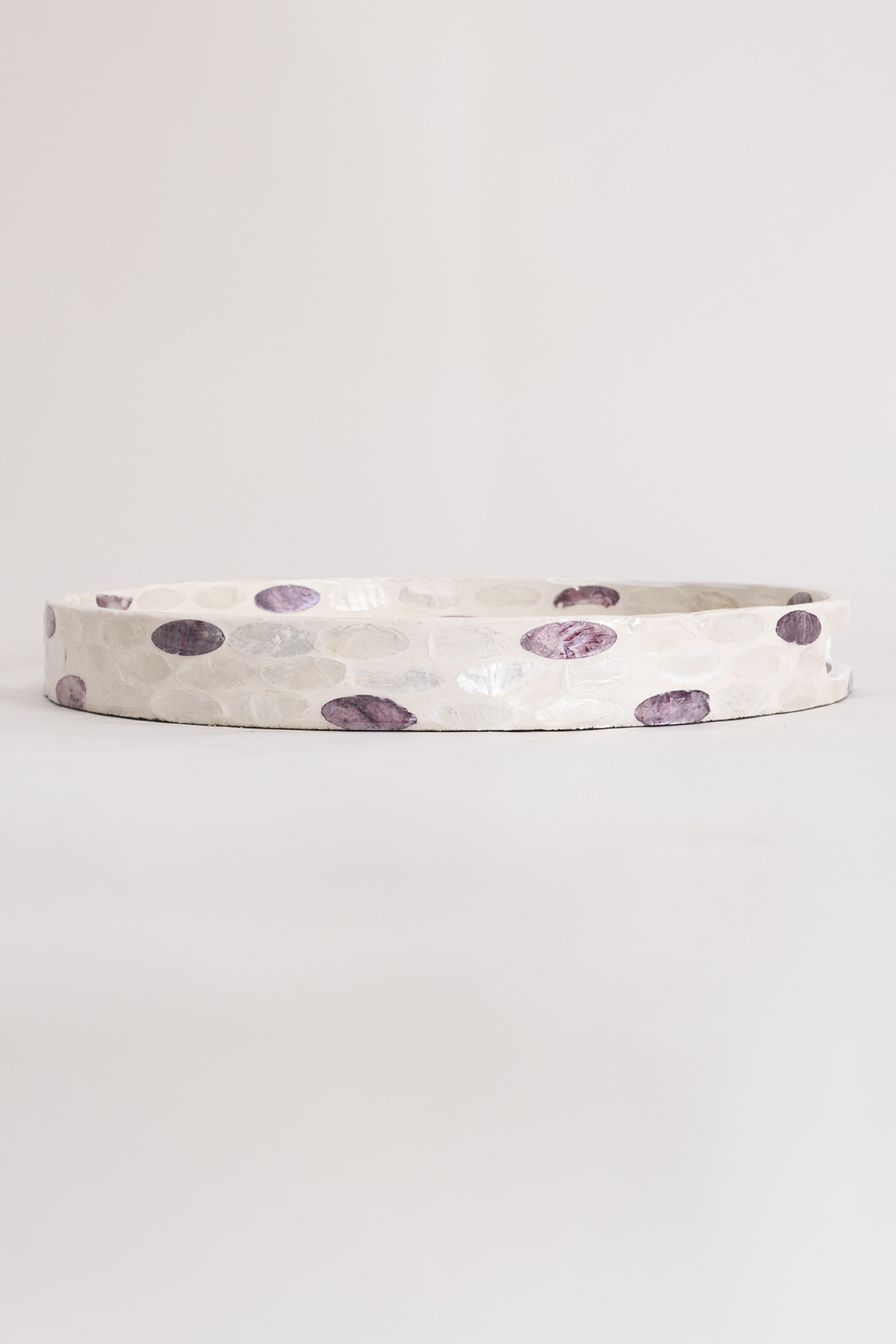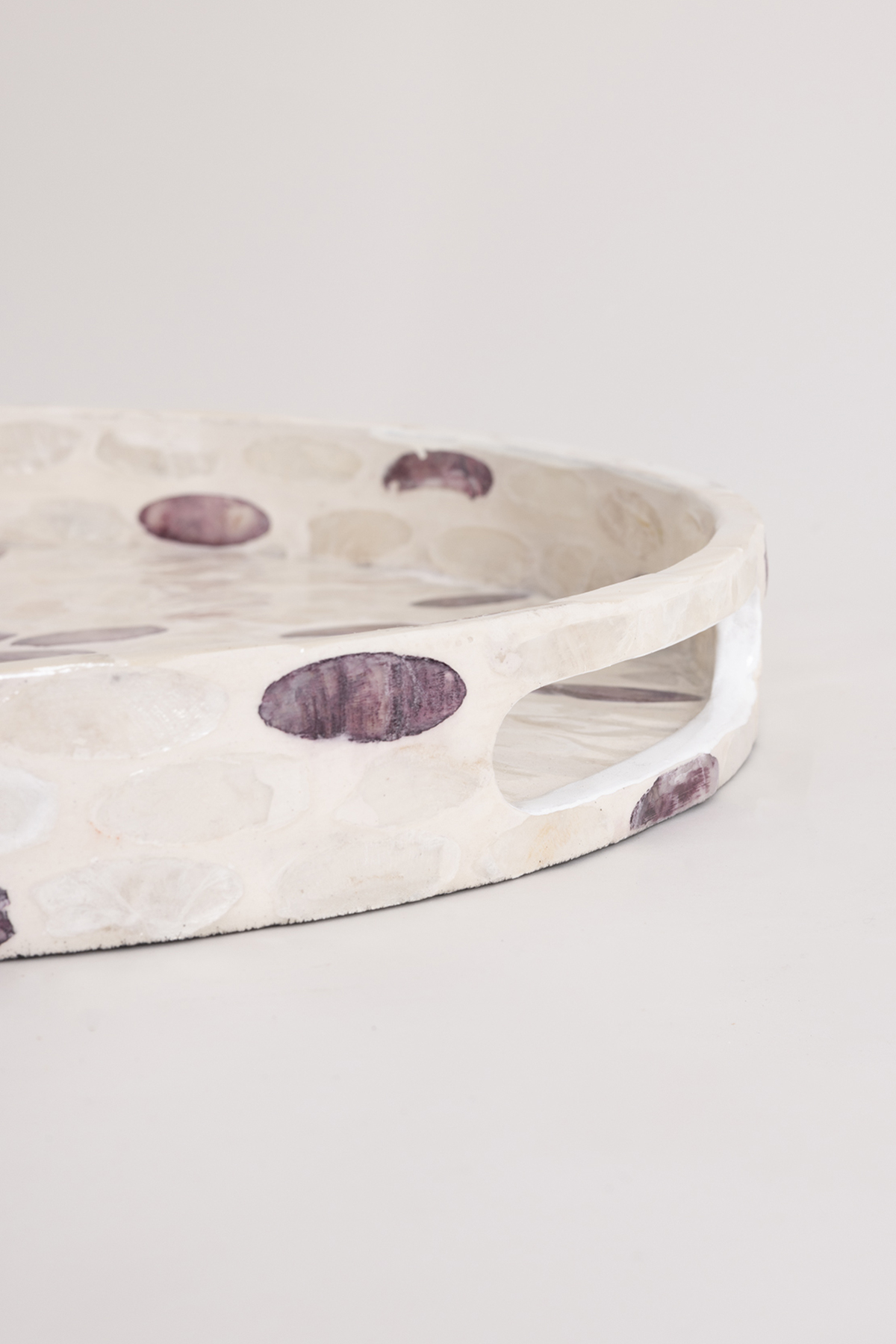 Meander Claret Red Detailed White Mother-of-Pearl Tray 30x3.5 cm 4322 Meander Claret Red Detailed Mother-of-Pearl Mosaic Tray displays the harmony of natural mother-of-pearl color with burgundy mother-of-pearl drop patterns, while capturing an authentic elegance far from the ordinary. It reveals the magnificent harmony of burgundy and natural mother-of-pearl tones by thinly cutting and gluing natural mother-of-pearl. This circular tray with a diameter of 30 cm has an elegant and functional design. The usage areas of this handmade tray are endless. It is a perfect choice for home decoration enthusiasts. You can add a natural atmosphere to your space by using it as a candle or accessory tray on the table or coffee table. It is also an ideal option for serving your meals or snacks in the kitchen. Each one is unique with its handmade details. Meander Claret Red Detailed Mother-of-Pearl Mosaic Tray brings functionality and aesthetics together, creating an elegant touch to your living space. Products made from natural materials are collected in their natural environment, naturally, and are produced by handcraft without any processing for the sake of a perfect appearance or using any molds to obtain a fixed size. Again, there may inevitably be very small plus/minus differences in the measurements of handmade products. Note: Actual colors may vary depending on lighting and monitor settings.