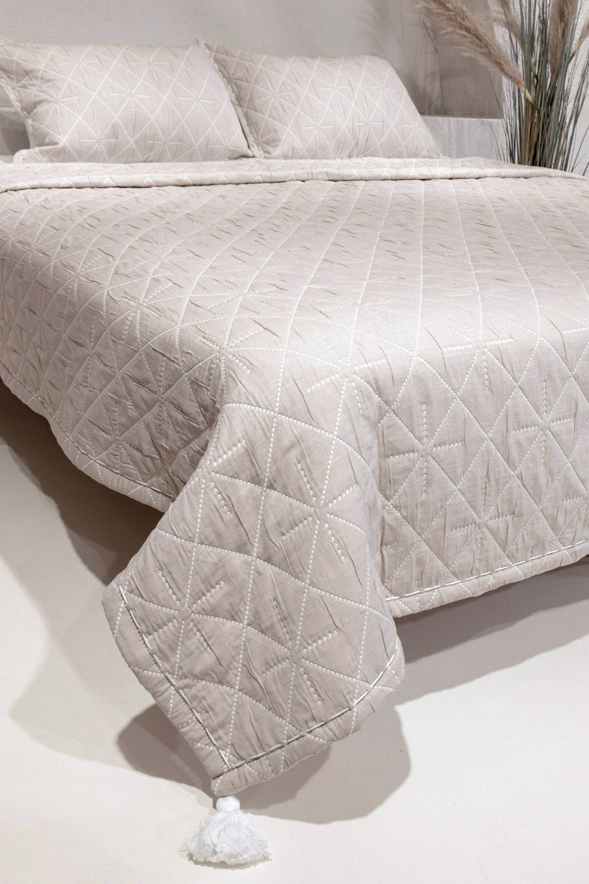It stands out with its soft textured cotton fabric and diamond patterned stitching details. It provides a perfect fit for your environments with 1 Bedspread (230x250) and 2 Pillowcases (50x70). It offers a soft and comfortable use, and relaxes with the comfort of cotton. While the shepherd's stitch edges design adds elegance, it can be easily used in different living spaces. It completes your bedrooms in an orderly and stylish way, and adds an elegant air to your bed. Thanks to its functional structure, it can be used as a cover in different areas such as the living room other than the bedroom. You can use it on the bed and base. Be sure to wash the bedspread in the washing machine at 30 °. Do not use bleach and detergent with bleaching properties. Avoid washing with harsh chemicals such as bleach or alcohol to preserve the quality of the fabric. Drying by spreading is recommended. During the drying process, avoid exposure to direct sunlight to prevent possible fabric damage. Note: Actual colors may vary depending on lighting and monitor settings.
