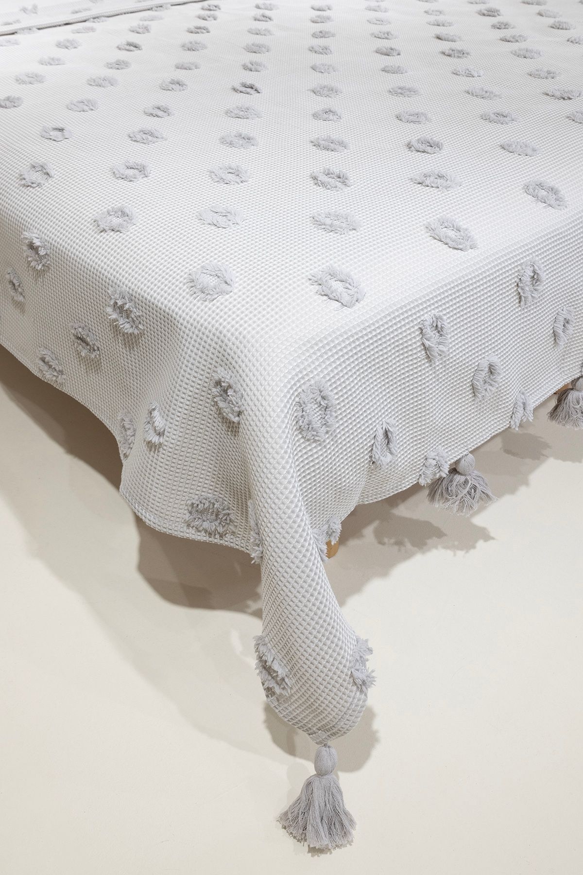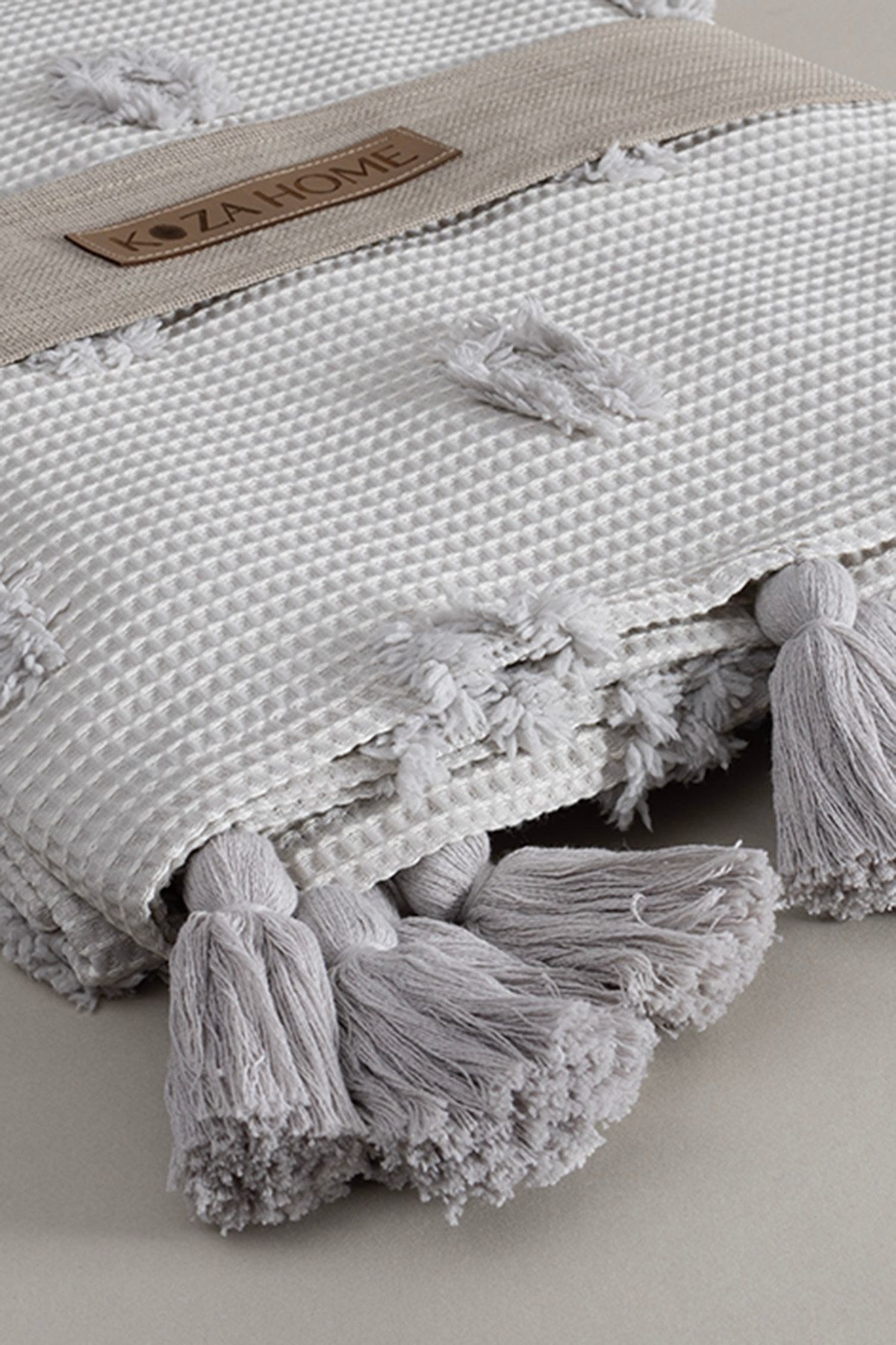 Wanda Gray Double Edge Tasseled Blanket 220x240 5025 This carefully crafted blanket provides a wide coverage area with a generous size of 220x240 cm. It adds calmness and elegance to your room with its elegant gray, cream and lilac color options. It offers a soft and comfortable feel thanks to its high-quality cotton content. This blanket combines both comfort and aesthetics, effortlessly transforming your bedroom into a haven of peace. Ideal for those looking for a tidy and stylish bedroom, this blanket provides a flashy and harmonious look thanks to its wide coverage area and is suitable for use as a bedspread. The circular tassel details on it reflect an original boho style, adding a unique atmosphere to your room. Wanda Double Edge Tasseled Blanket is a perfect way to organize your bedroom and add a stylish touch. Care Recommendation Washing at 30 degrees is recommended. No bleaching. No ironing required. Drying by spreading is recommended. No dry cleaning is recommended. Note: Actual colors may vary depending on lighting and monitor settings.