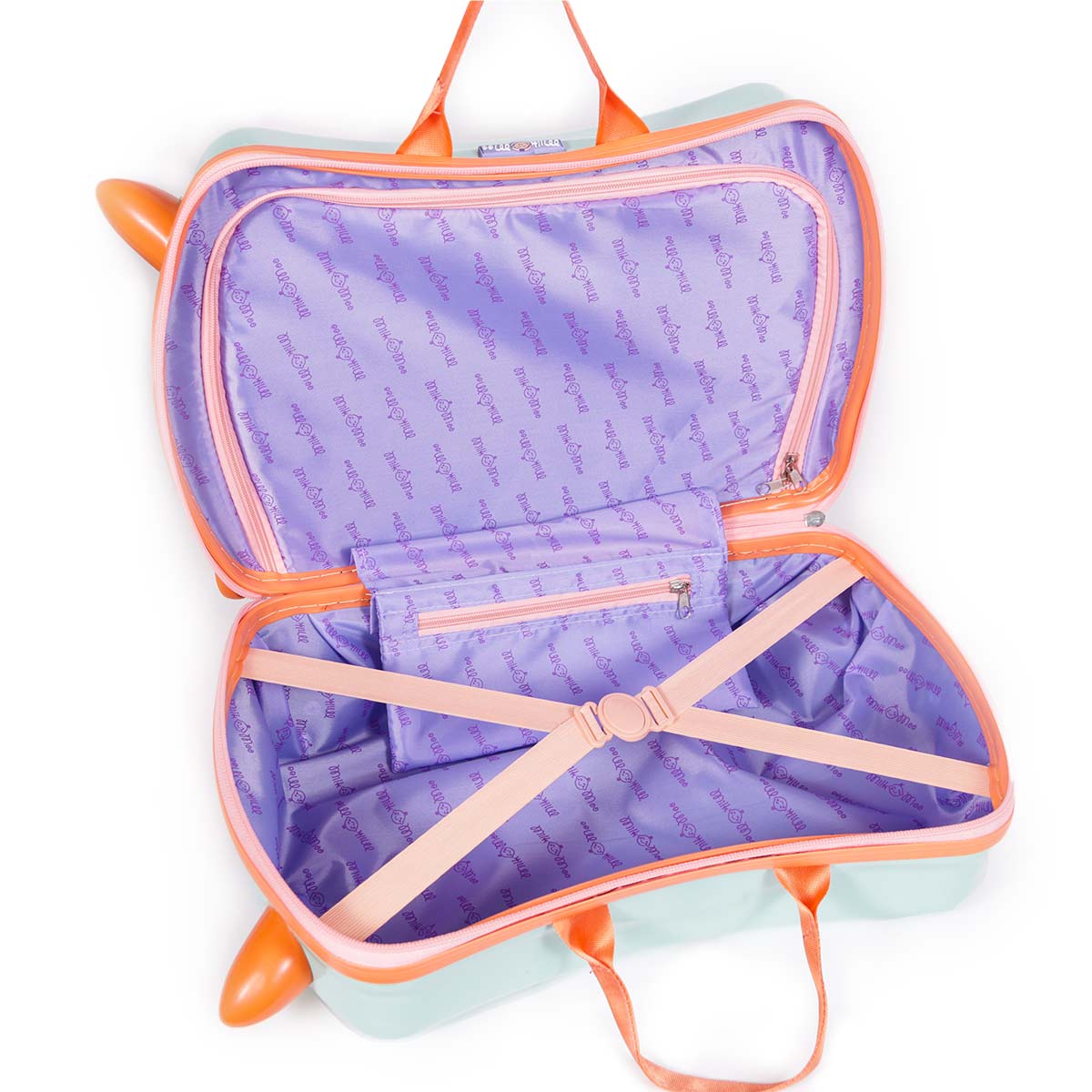 SPACIOUS INTERIOR: The rideable kids' suitcase offers ample interior space where your child can store all the items they might need during their travels. Toys, clothes, and other personal belongings can be easily accommodated. The zippered pocket inside allows them to carry small items without mixing them up.