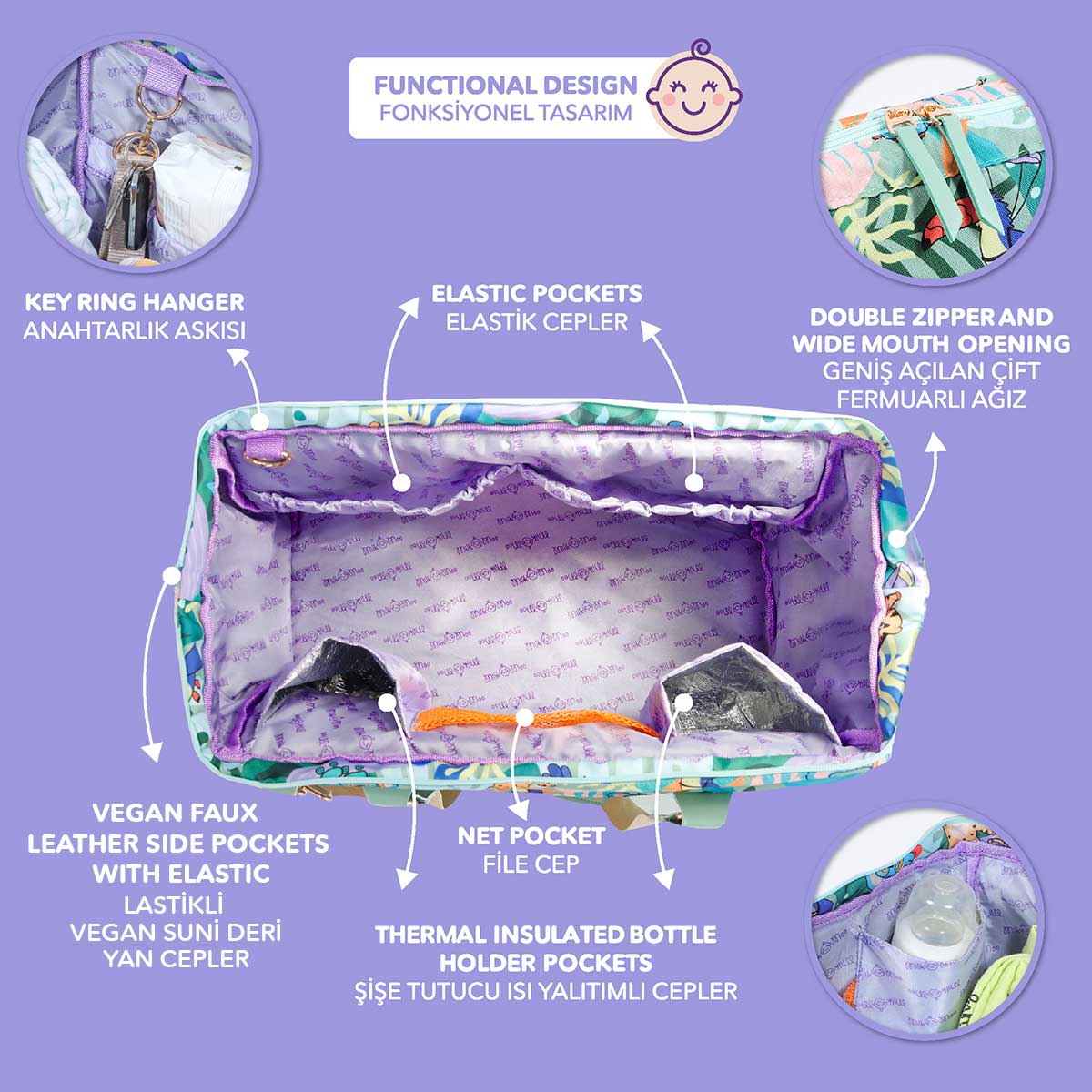 MILK&MOO DIAPER BAG: Milk&Moo diaper bag is made of high-quality polyster fabric and vegan leather. It is 100% wipeable and spill-resistant inside and out. It can be carried as a tote or worn like a shoulder bag. Double zippers with large teeth and pull tabs are easier to use. Dimensions: length: 14 in, width: 11 in, height: 11 in, weight: 2 Ib