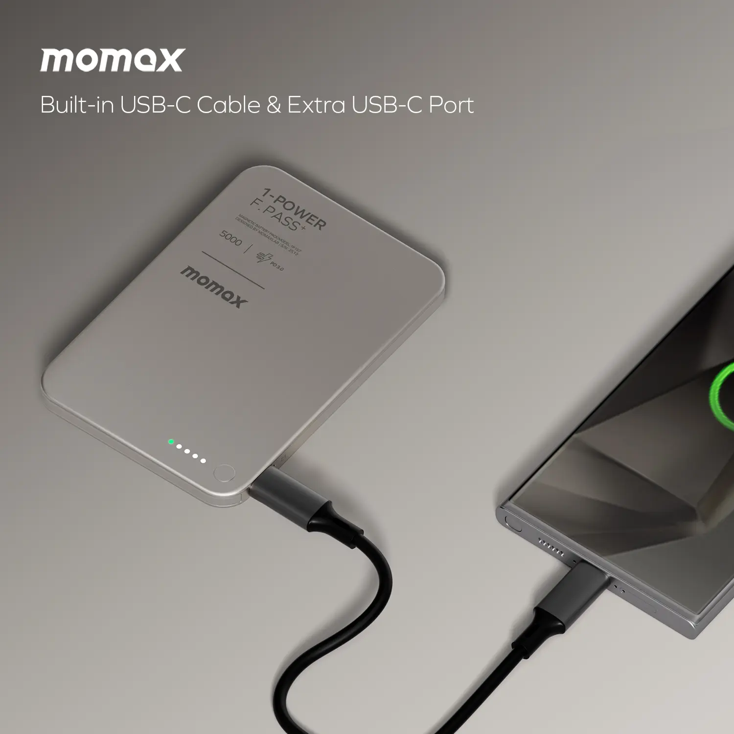 طارية Momax 1-Power F.Pass+ بسعة 5000 مللي أمبير/ساعة مع كابل مدمج وملحق مغناطيسي (تيتانيوم)